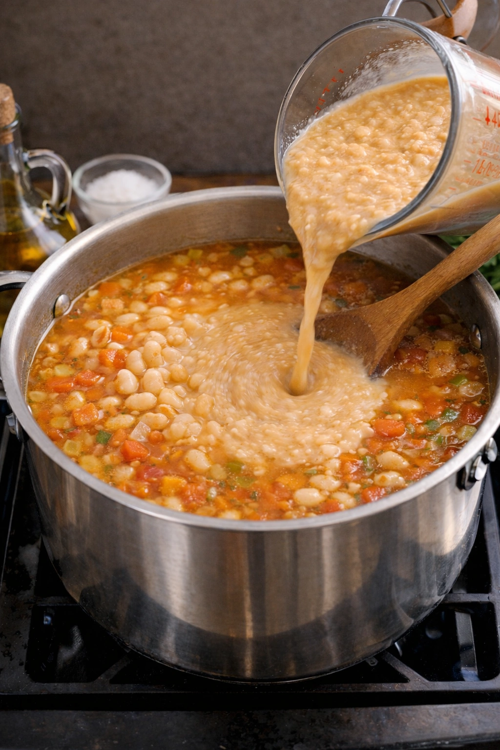 For an authentic Zuppa di Fagioli, we want a combination of whole beans and creamy texture. Therefore, after simmering, remove about 2 cups of the soup and blend until smooth using an immersion blender or regular blender. Afterward, return this puree to the pot and stir to incorporate.