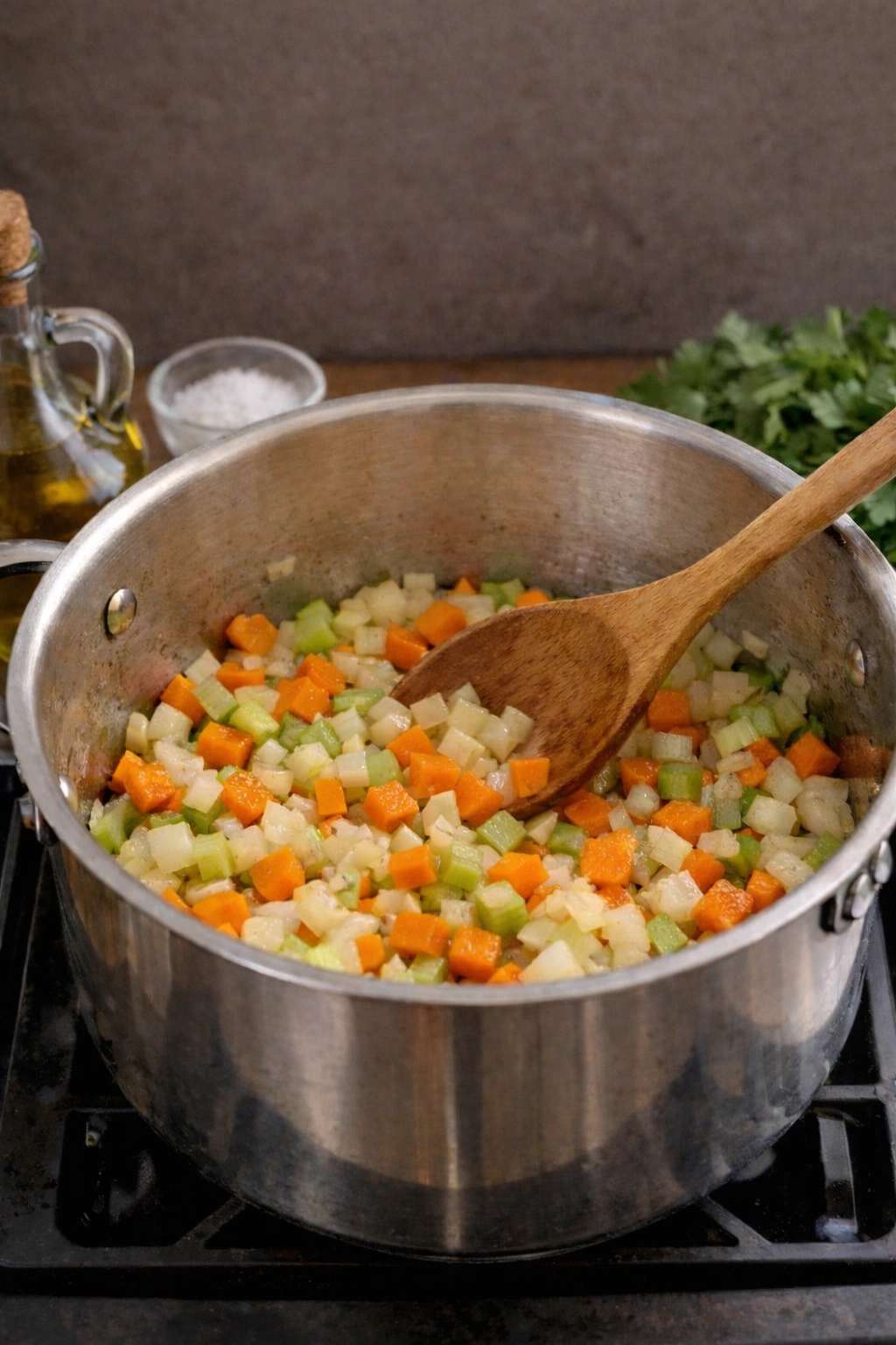 First, heat 2 tablespoons of olive oil in a large pot over medium heat. Add the chopped onion, carrots, and celery—the Italian “soffritto” that forms the foundation of many Italian soups. Cook for about 5 minutes until the vegetables soften. Then, add the minced garlic and cook for another 30 seconds until fragrant.