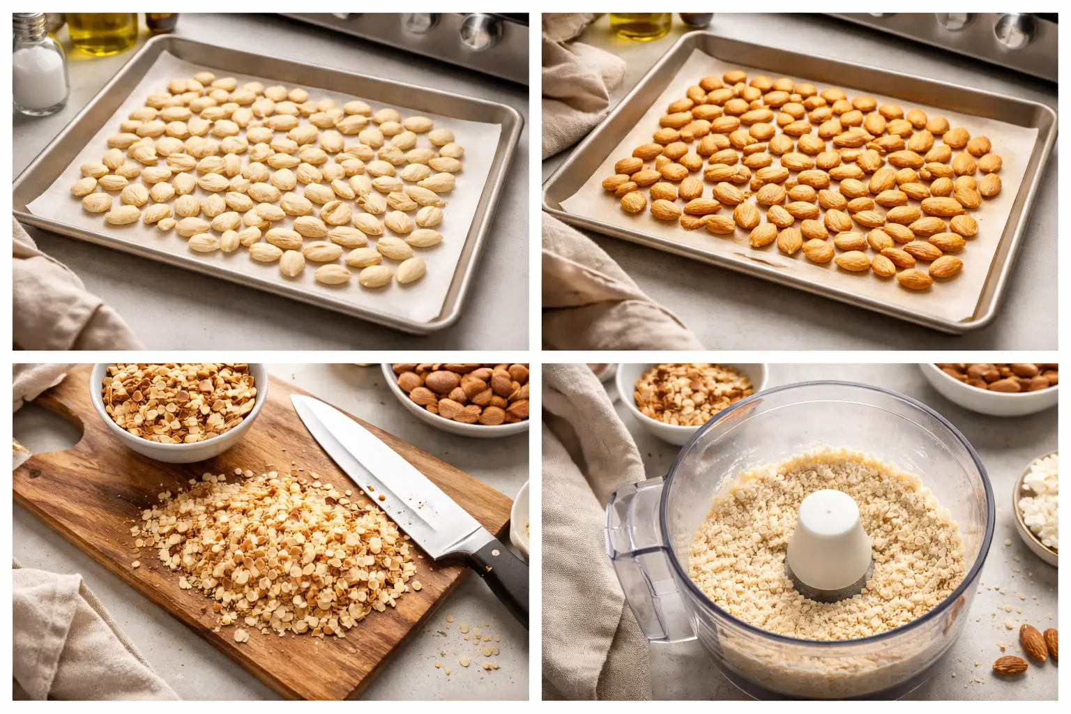 First, preheat your oven to 325°F (165°C). Spread the blanched almonds on a baking sheet and toast them for 8-10 minutes until golden and fragrant. After cooling, finely chop half the almonds and grind the remaining half into a powder using a food processor.