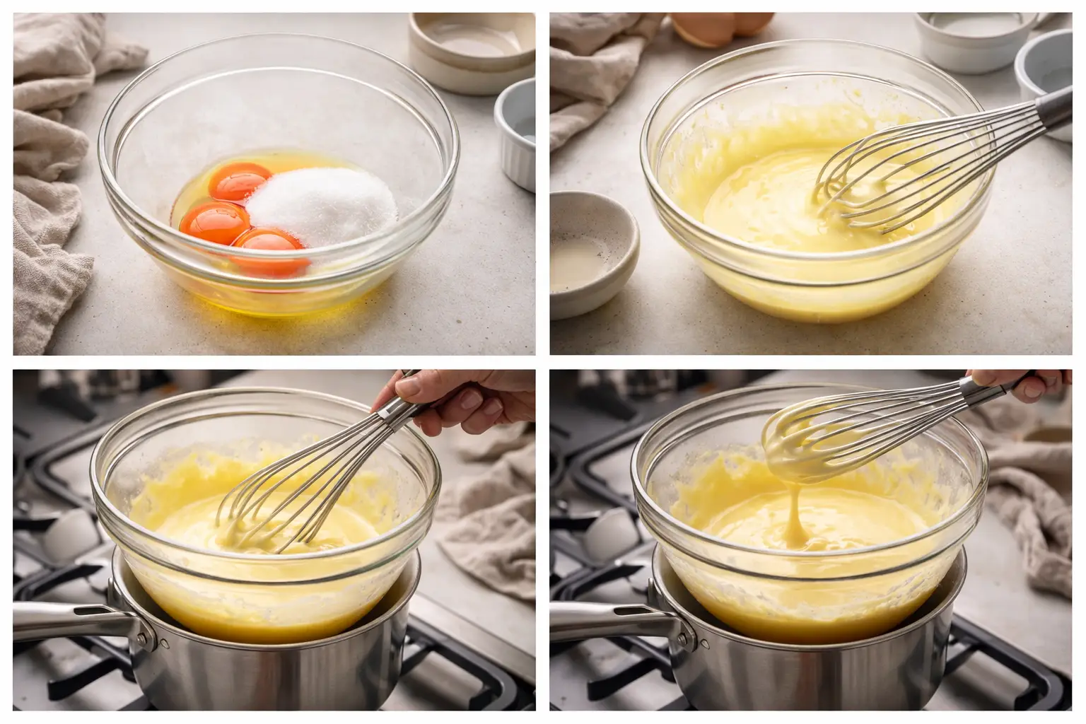 In a heatproof bowl, whisk the egg yolks with 60 g of sugar until pale and thick. Place the bowl over a saucepan of gently simmering water (double boiler method). Continue whisking for about 5 minutes until the mixture reaches a ribbon-like consistency. Remove from heat and allow it to cool completely.