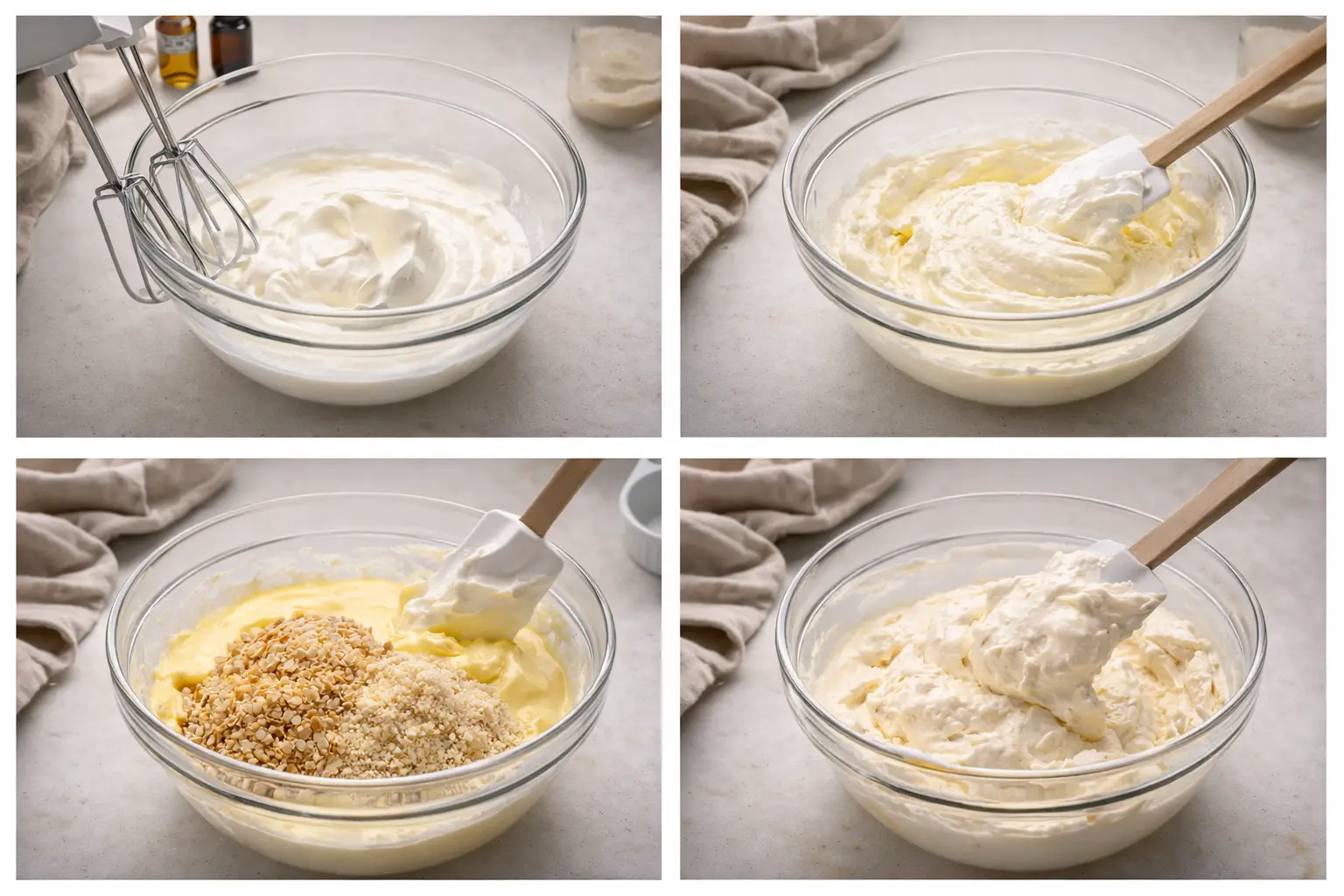 In a large bowl, whip the heavy cream with the almond extract and vanilla extract until soft peaks form. Gently fold in the cooled custard mixture along with the chopped and ground almonds.