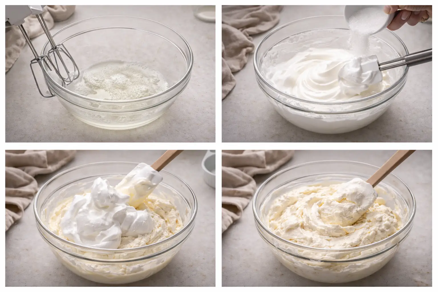 In a clean bowl, beat the egg whites with a pinch of salt until foamy. Gradually add the remaining sugar while beating until stiff, glossy peaks form. Carefully fold the meringue into the cream mixture in three additions.