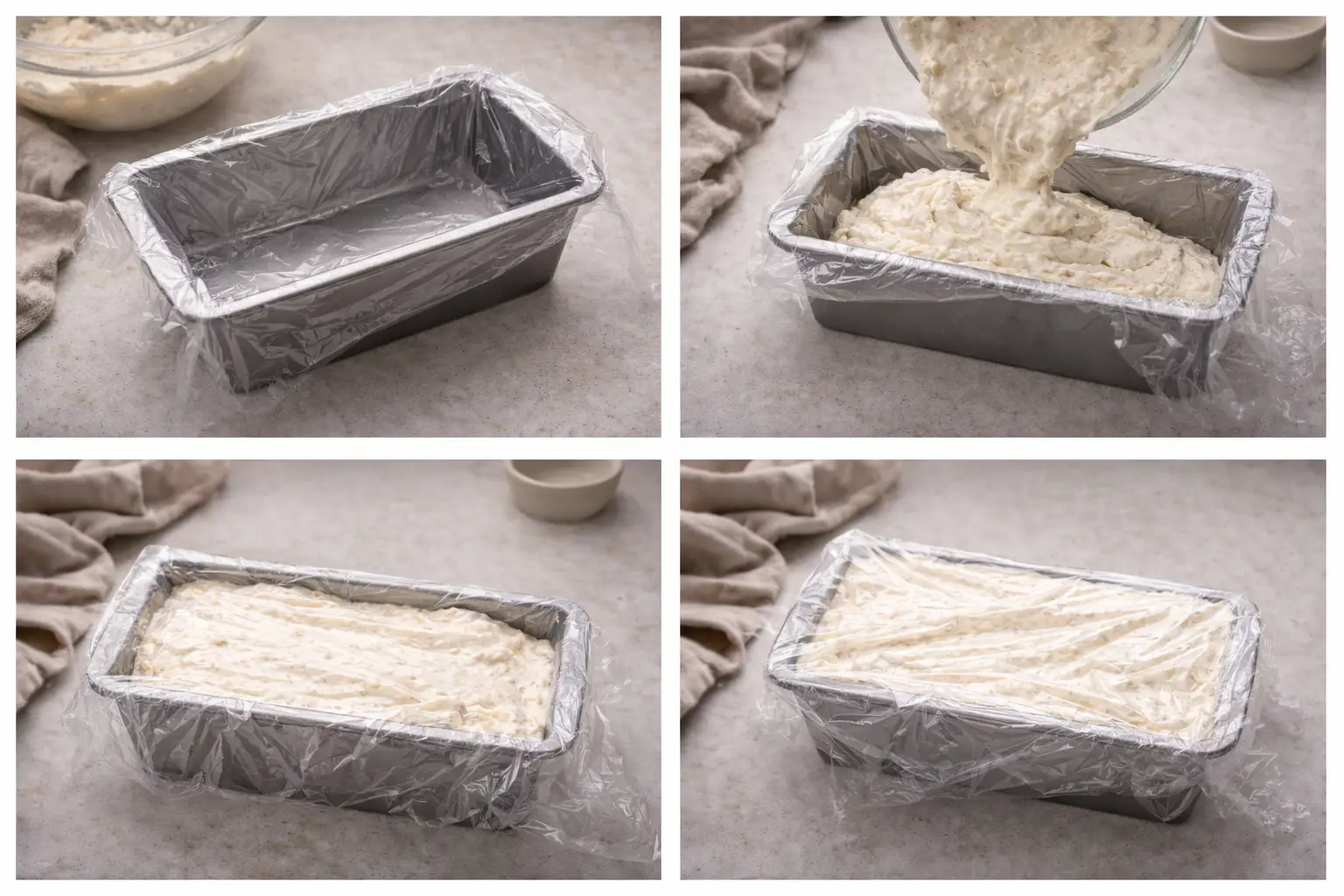 Line a loaf pan with plastic wrap, allowing extra wrap to hang over the sides. Pour the semifreddo mixture into the pan and smooth the top. Cover with the overhanging plastic wrap and freeze for at least 6 hours, preferably overnight.