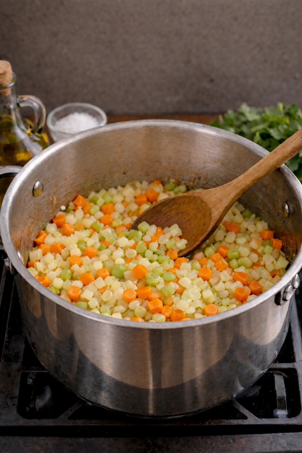 1. Sauté the Base Vegetables: In a large Dutch oven or soup pot, heat olive oil over medium. Add onion, carrots, and celery. Cook, stirring occasionally, for 8–10 minutes until softened but not colored.