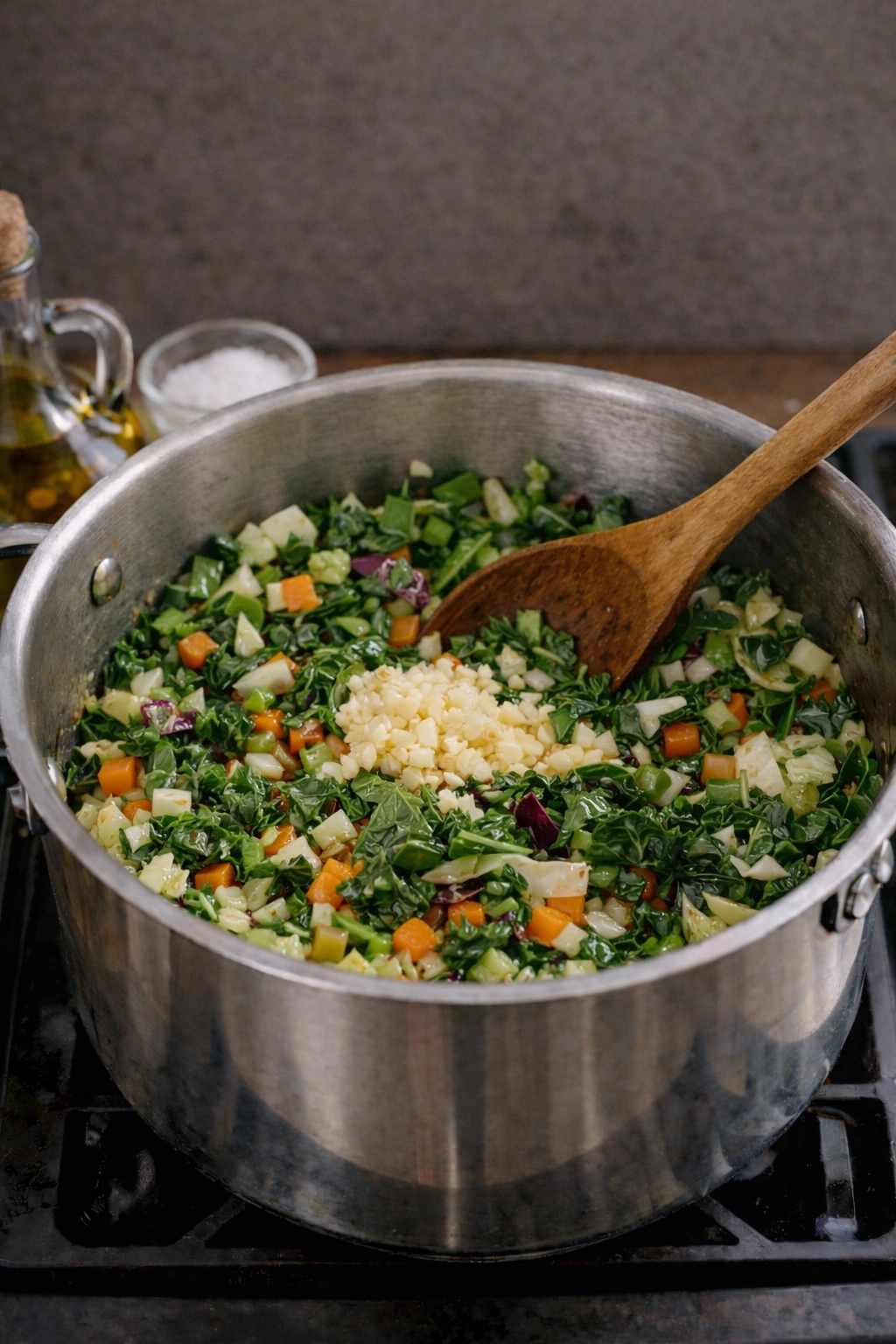 Stir in minced garlic, chopped kale, chard, and cabbage. Sprinkle with a pinch of salt. Continue cooking until the greens are wilted, about 6–8 minutes.