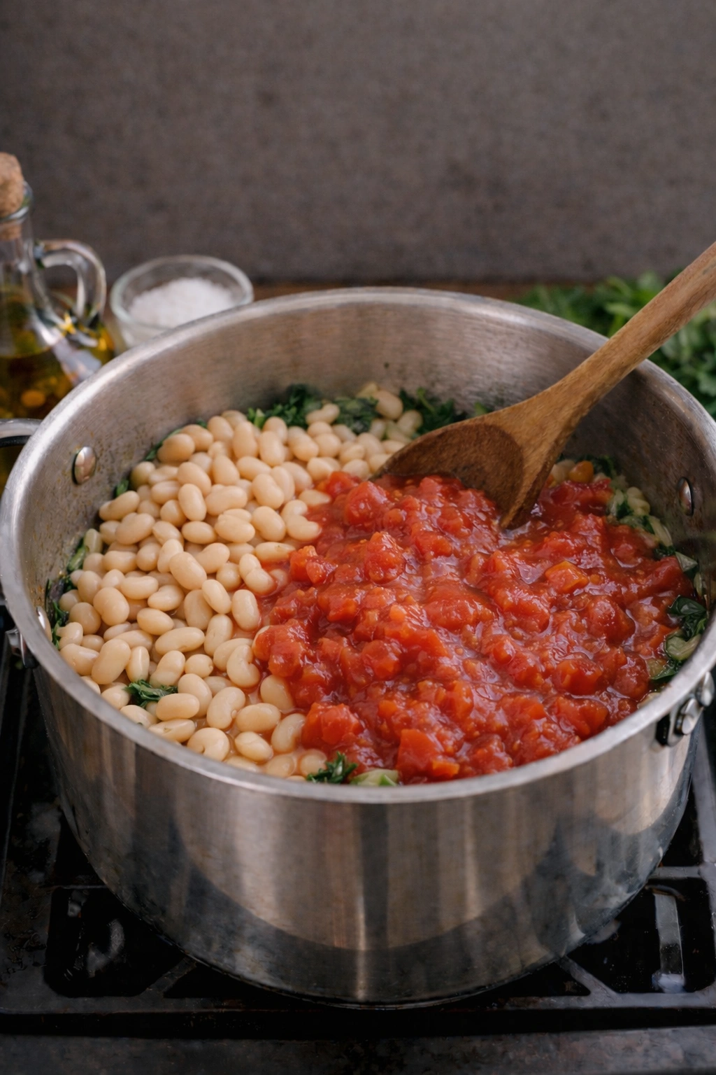 3. Layer Beans and Tomatoes: Pour in the drained cannellini beans and add the crushed tomatoes. Stir well.