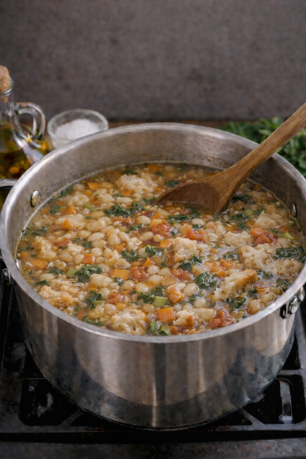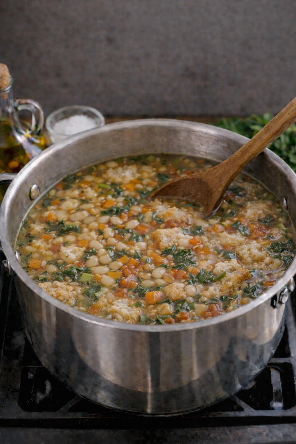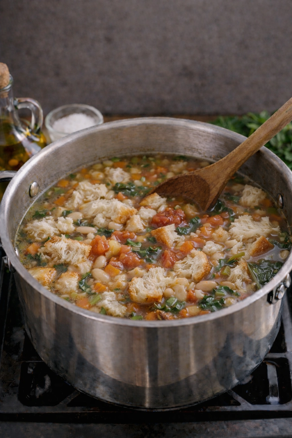 6. Final Simmer: Keep the soup at a low simmer for another 15–20 minutes to let the bread thicken the broth and flavors meld.