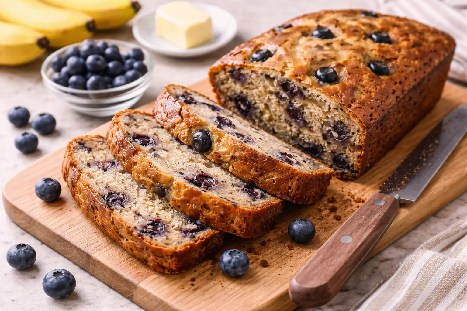 Slice the banana blueberry bread and serve it as a delightful breakfast or snack.