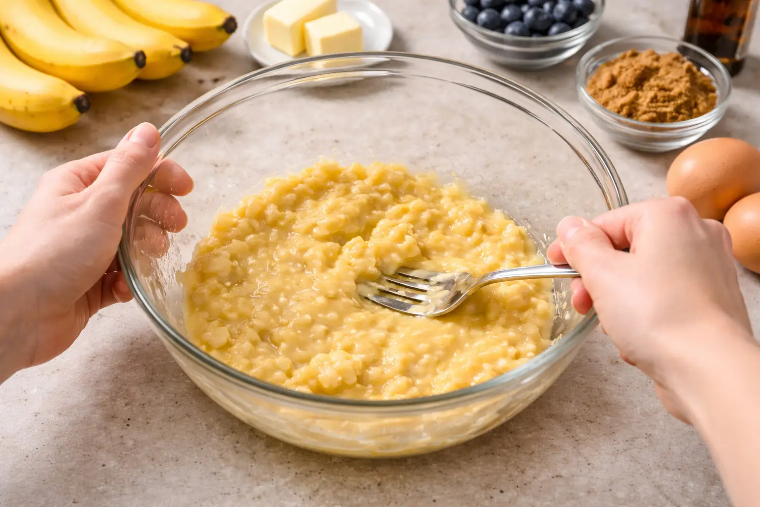 The best way to mash bananas is with a fork or potato masher until smooth with a few small lumps for texture.