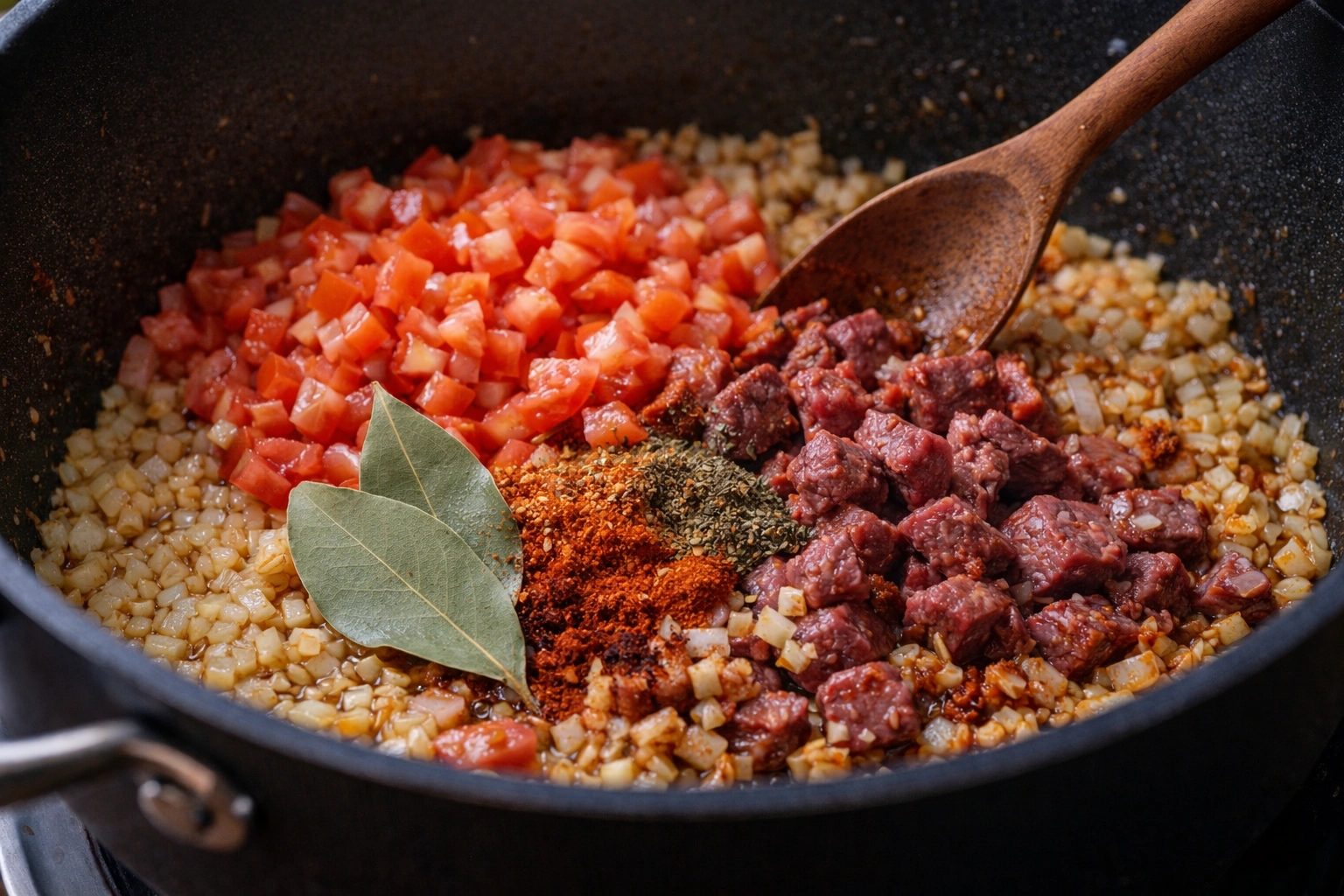 3. Build the flavors: Next, stir in the tomato paste and cook for 2 minutes to caramelize slightly. If you’re using meat, add it now and brown for a few minutes. Subsequently, add the diced tomatoes, paprika, bay leaves, and oregano, stirring to combine all ingredients well.