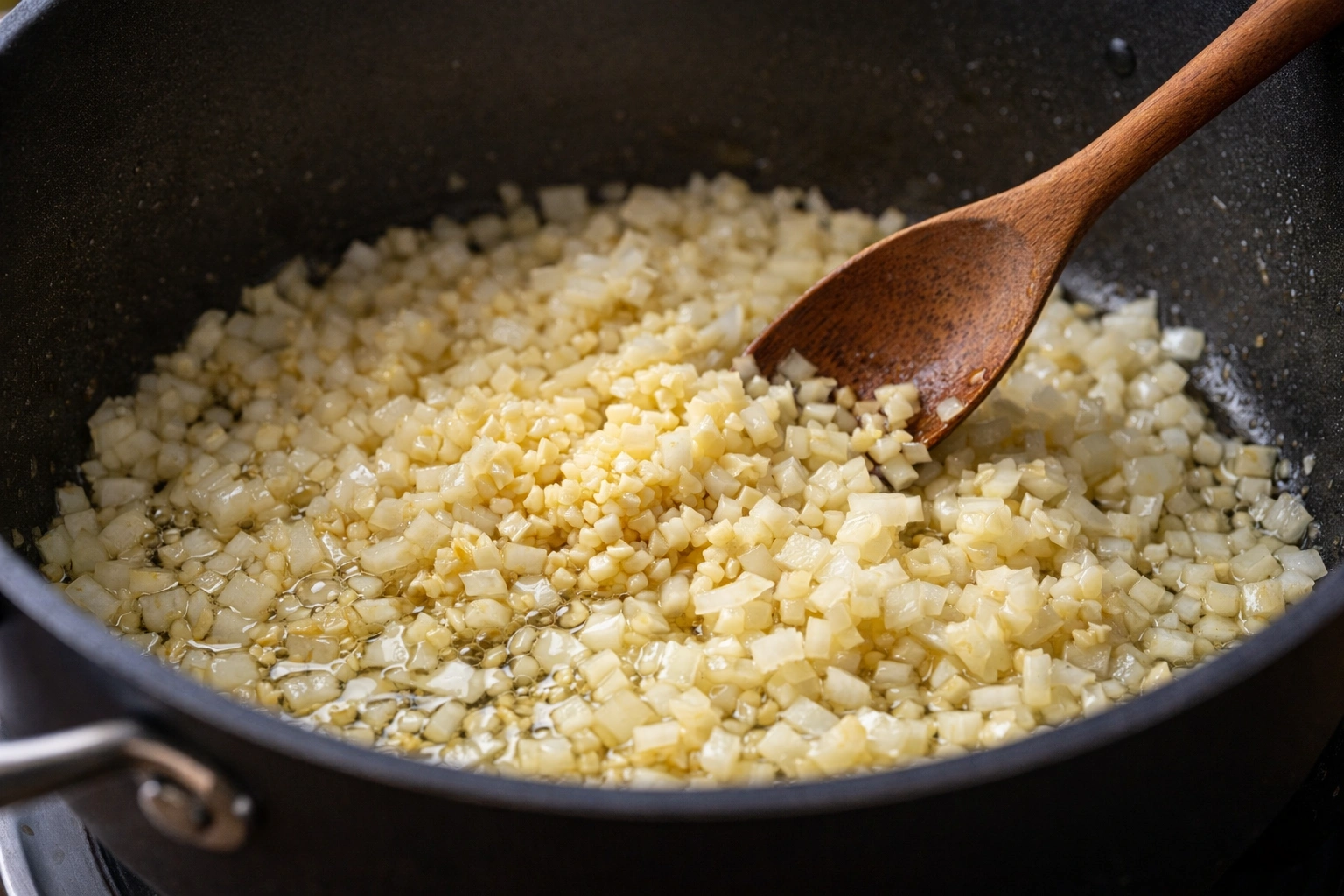 After draining and rinsing your soaked beans, heat olive oil in a large pot over medium heat. Add the diced onions and sauté until translucent, about 5 minutes. Then add the minced garlic and cook for another minute until fragrant.