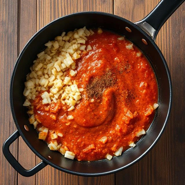 In the same pan, heat oil or ghee on medium. Add chopped onions, cooking until deeply golden and fragrant. Add the garlic, ginger, chili, and dry spices, stirring constantly. Once aromatic (about 1-2 minutes), pour in the tomato sauce. Stir well and simmer gently for 10-15 minutes until the sauce thickens.