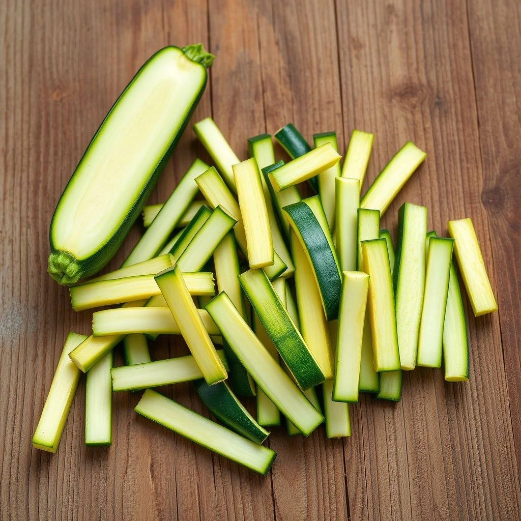 - Wash zucchinis and trim the ends. Cut each zucchini in half, then slice into fry shapes—about ½-inch thick and 3-4 inches long.