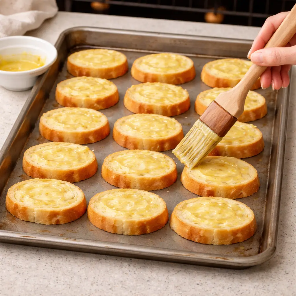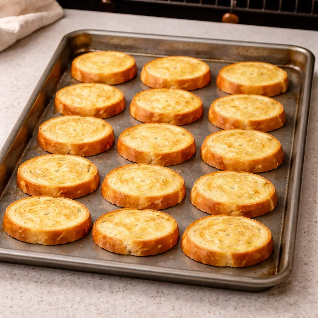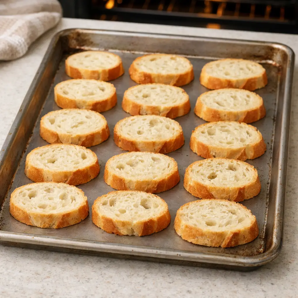 Arrange the baguette slices in a single layer on a baking sheet.