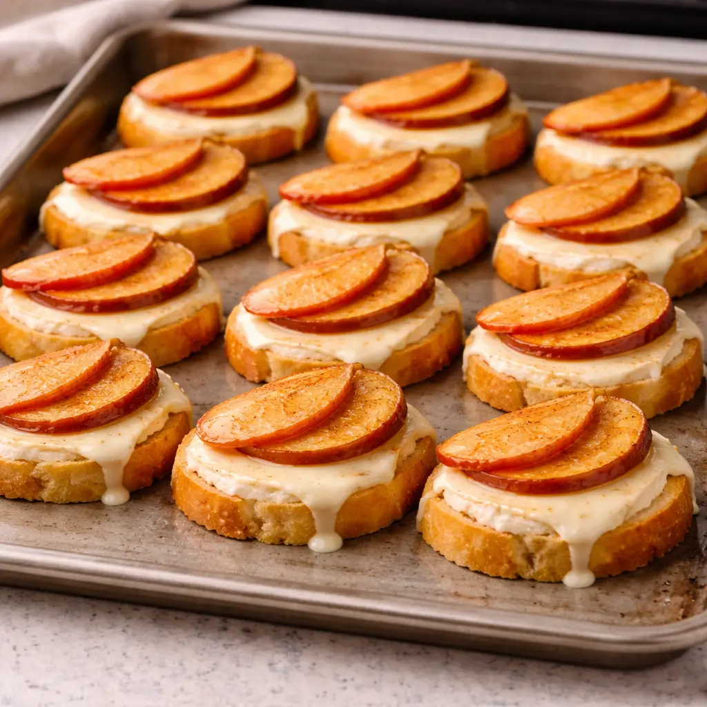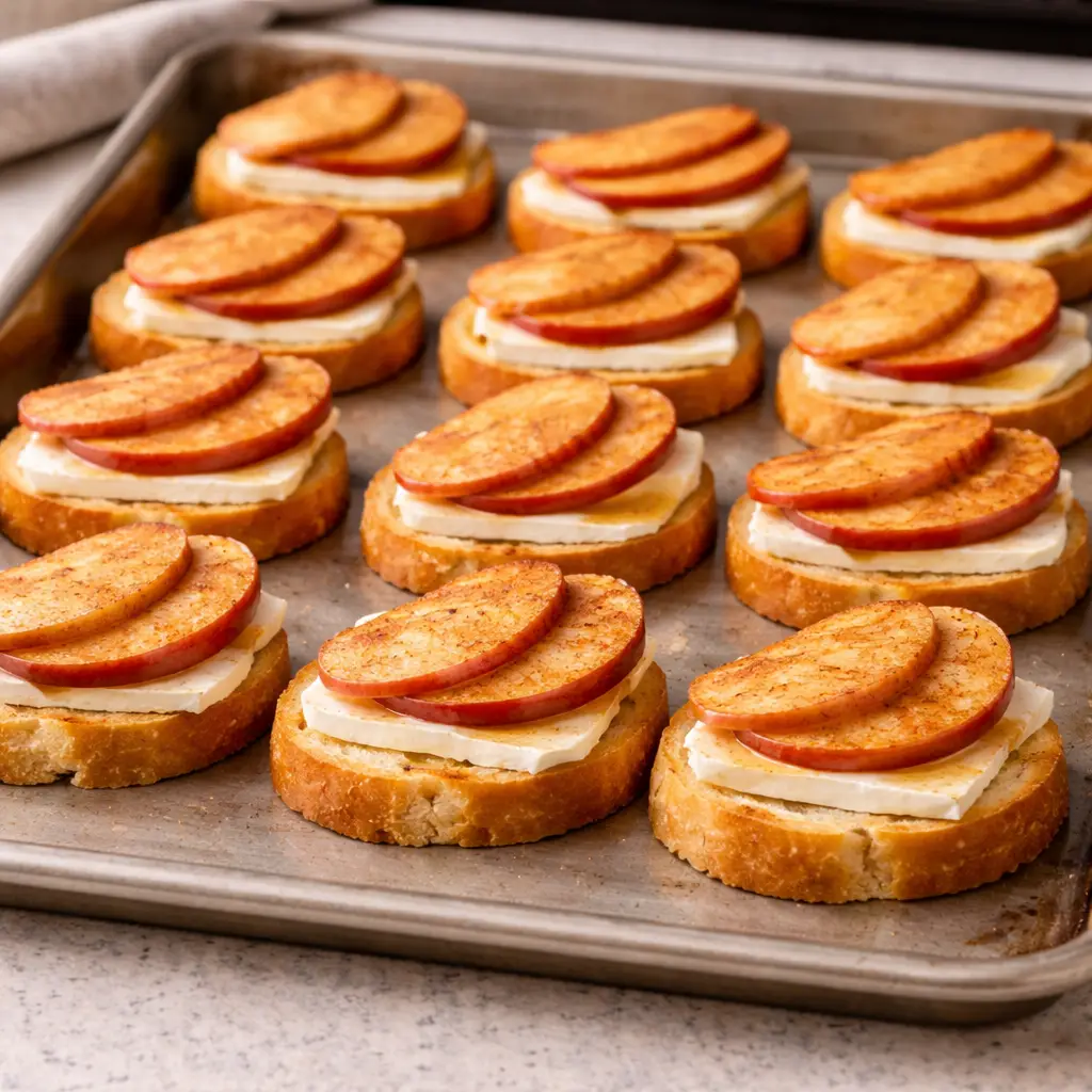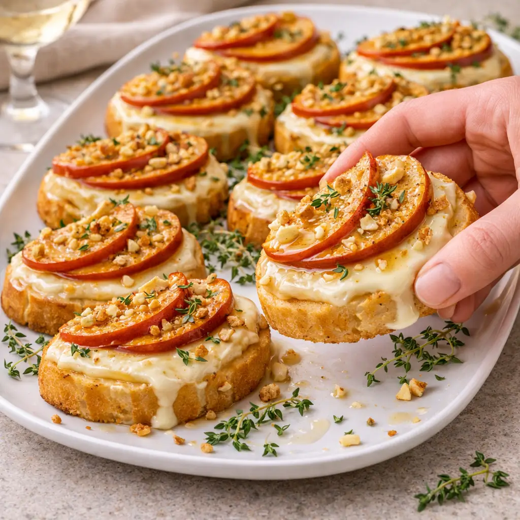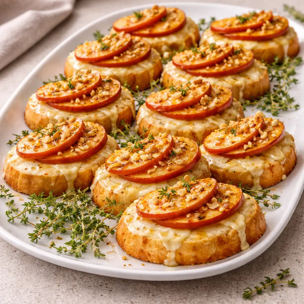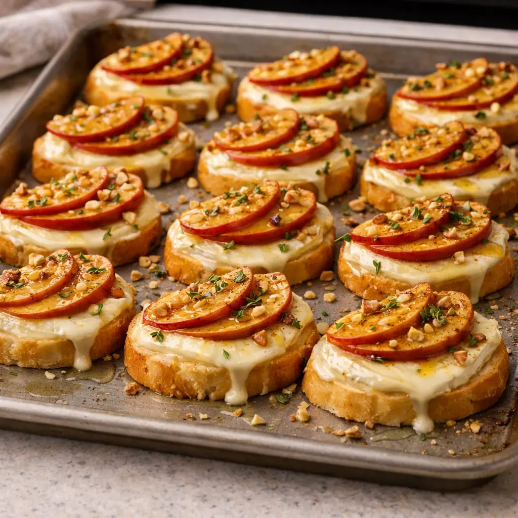 Crispy baguette topped with creamy melted brie, sweet caramelized apples, and a touch of honey—an easy, elegant fall appetizer perfect for parties, holidays, and cozy gatherings.