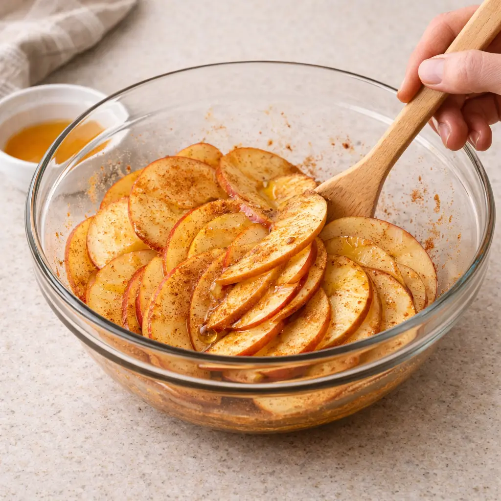 Coating the apples evenly ensures a balanced sweet-spiced flavor.