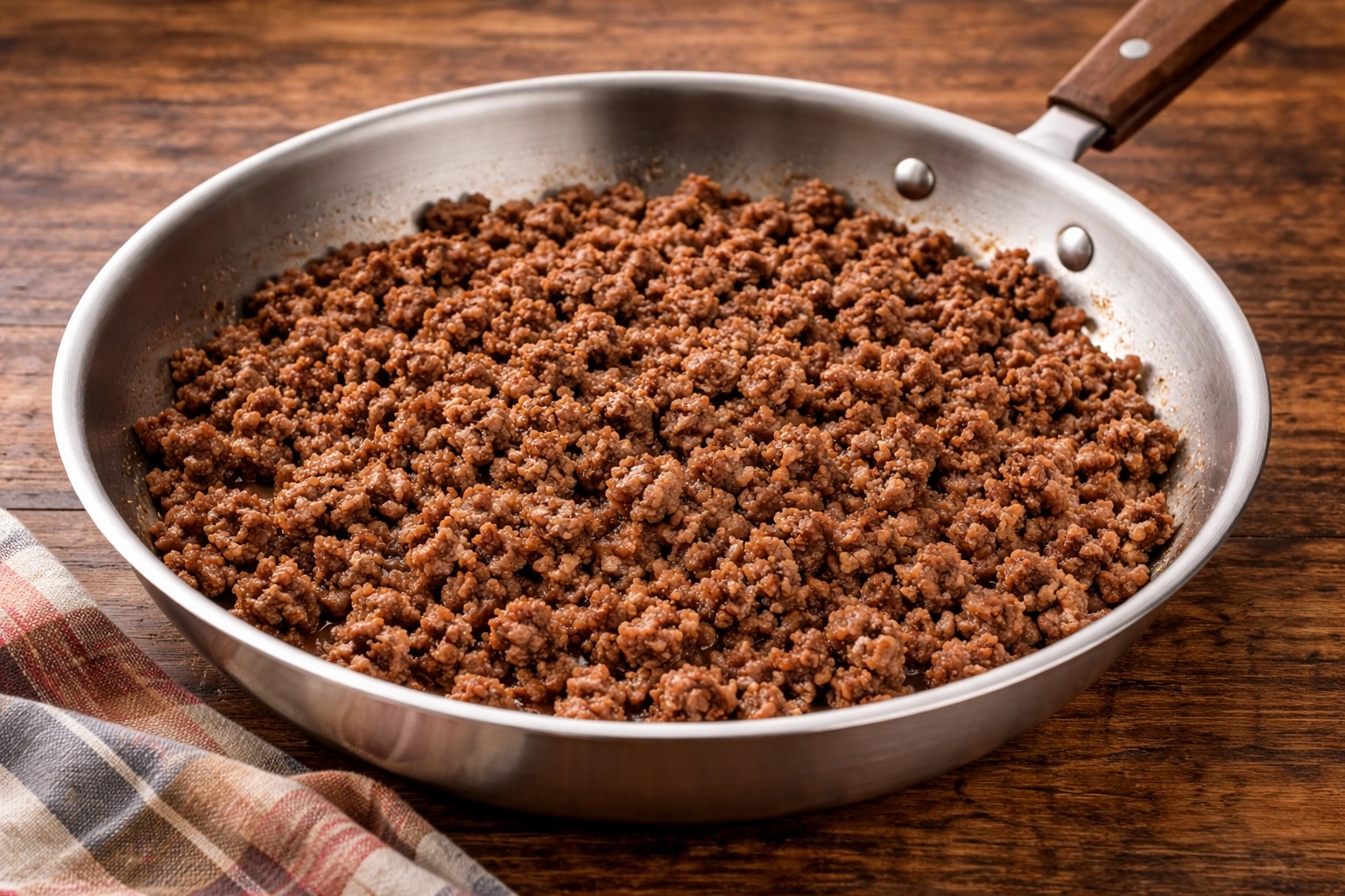 In a skillet over medium heat, cook the ground beef until browned. Drain any excess fat.You can add onions, garlic, or Mexican spices for extra flavor.