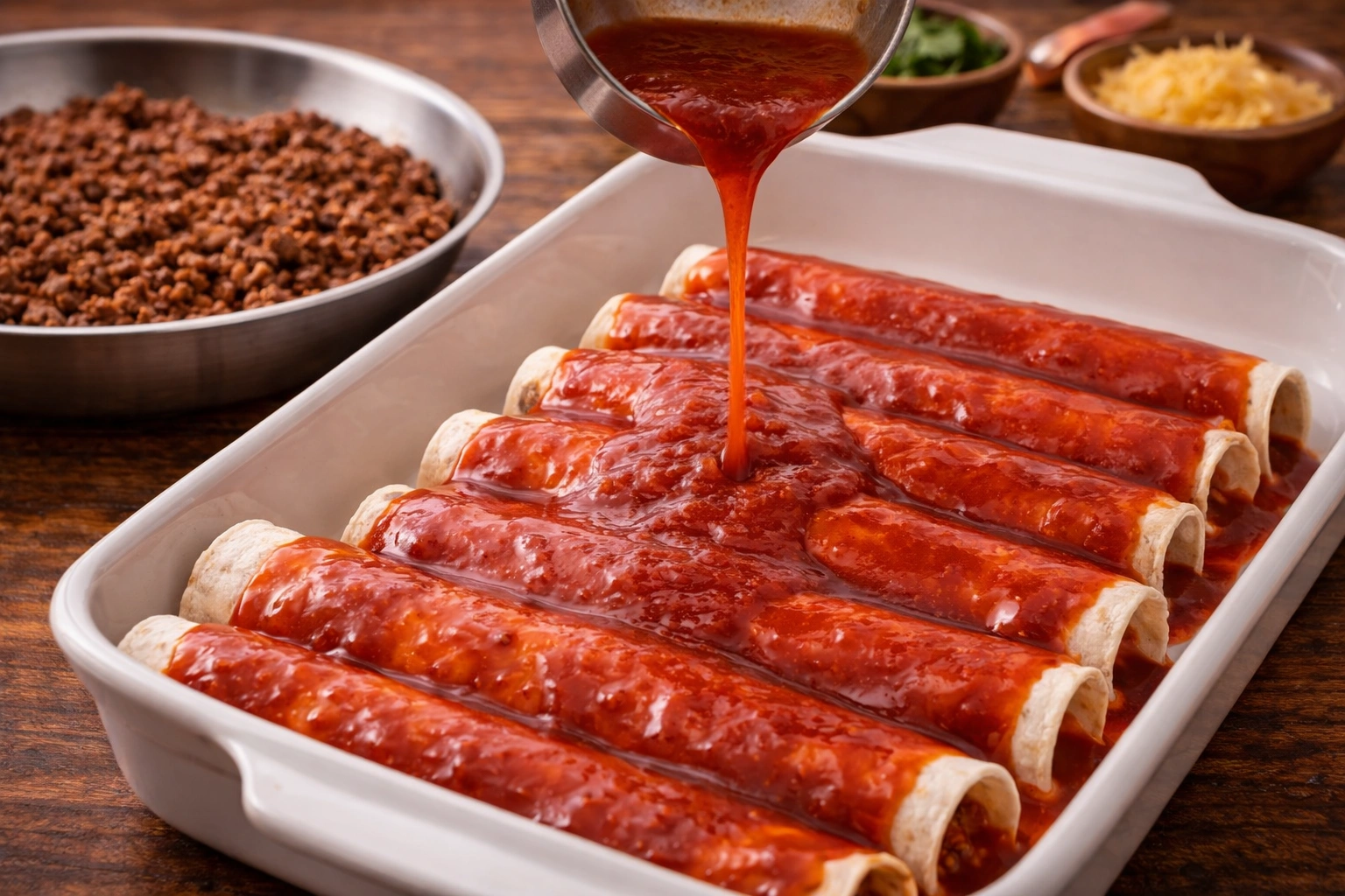 Pour enchilada sauce over the rolled tortillas, ensuring they are all covered evenly.