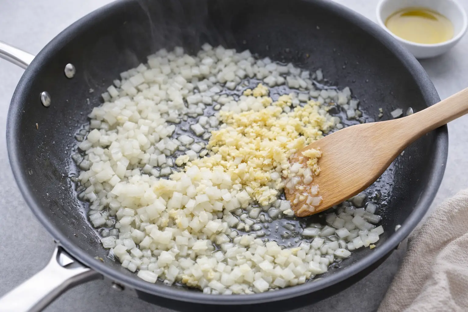 In a large skillet or wok, heat coconut oil over medium-high heat. As the oil shimmers, add the onion and sauté for about 2 minutes, until it starts to soften. Now, stir in the garlic and ginger. Stir everything frequently, since aromatics can burn quickly.