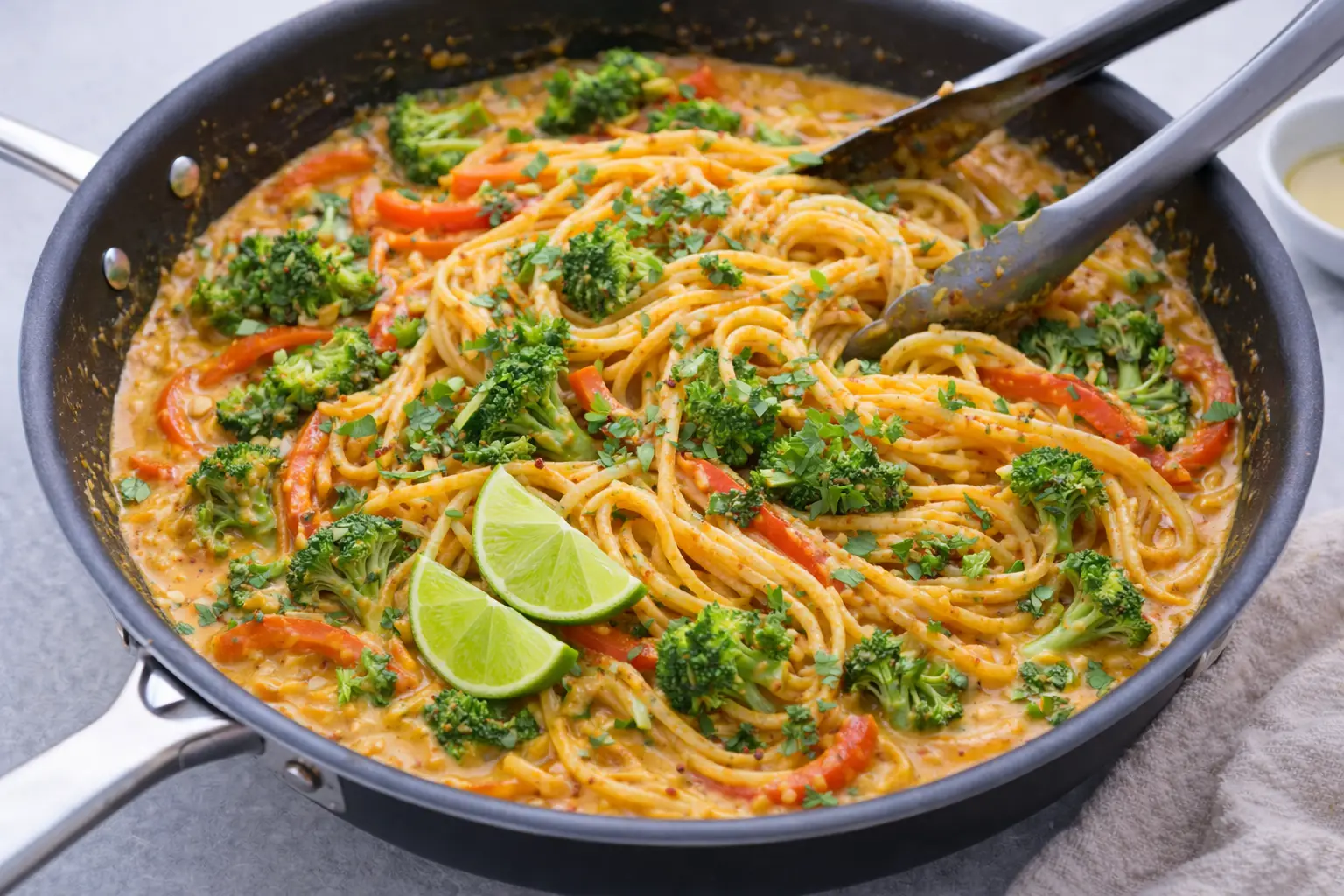 Creamy coconut curry noodles with vibrant vegetables in a rich, aromatic sauce. This easy vegan dinner is quick to make, packed with bold Thai-inspired flavors, and perfect for a comforting weeknight meal. 🍜🥥