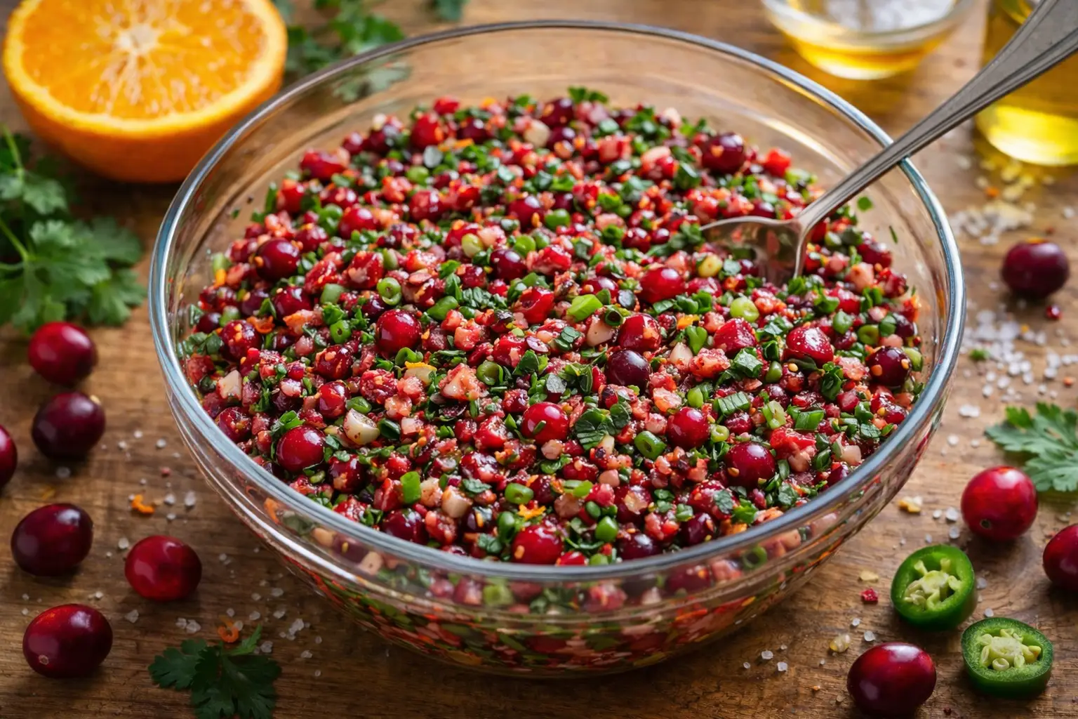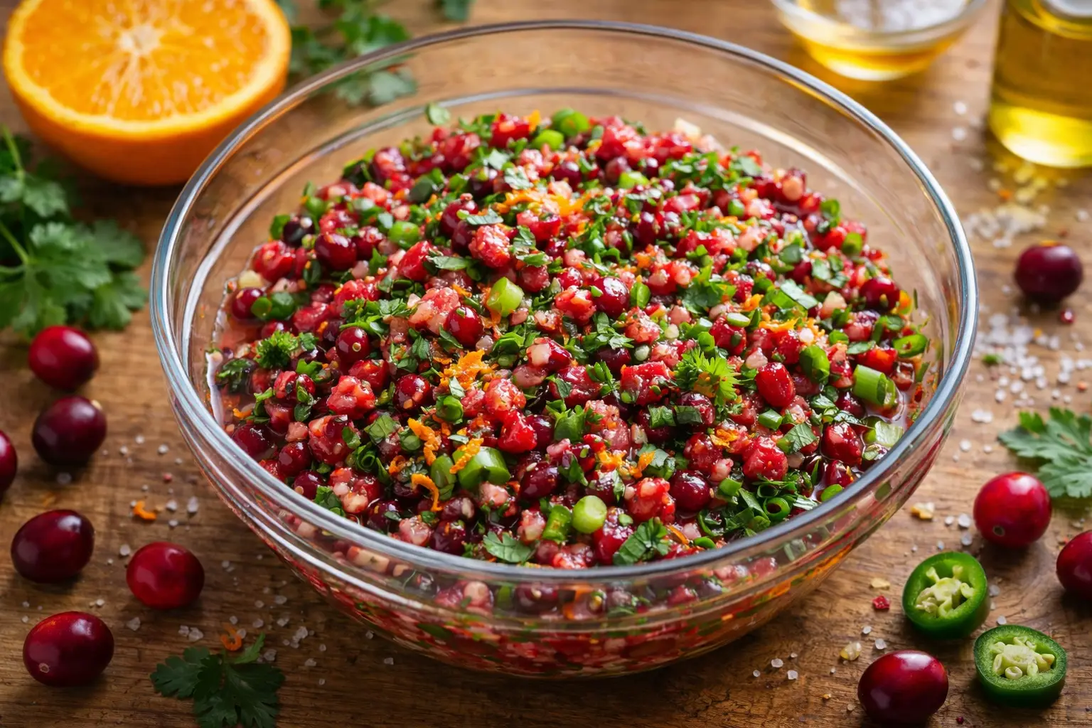 In a medium bowl, add the chopped cranberries, green onions, minced jalapeño, cilantro, parsley, orange zest, orange juice, honey, olive oil, and salt.