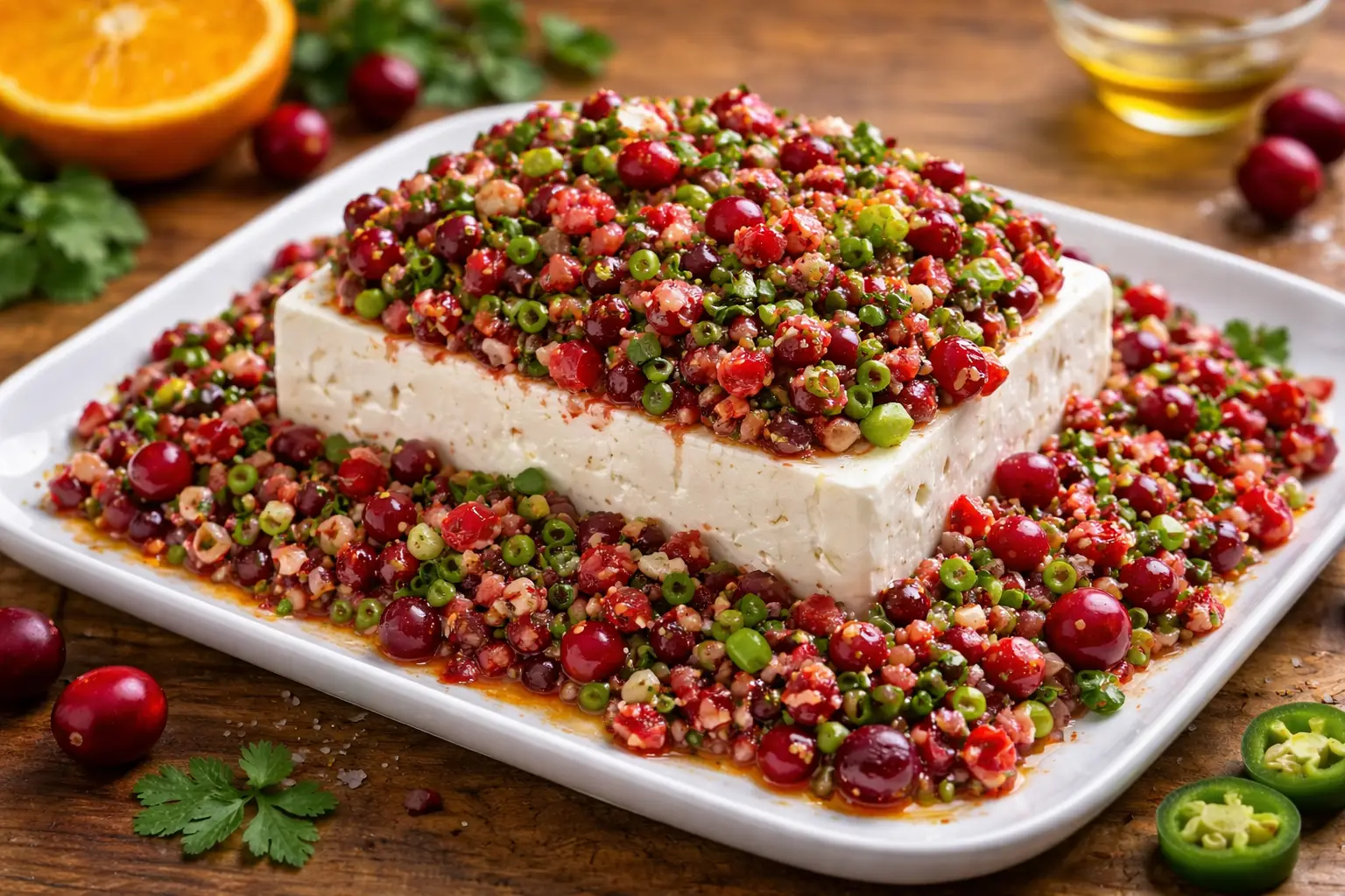 Place the block of feta cheese on a serving plate. Spoon the chilled cranberry mixture generously over and around the feta.