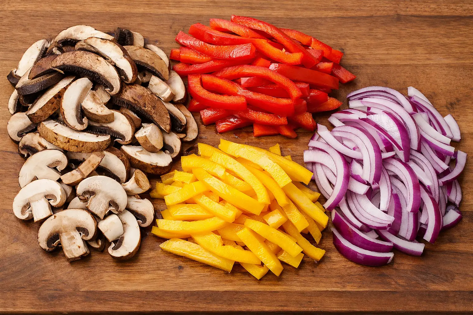 Slice the mushrooms, red bell pepper, yellow bell pepper, and red onion into thin strips to create the classic fajita texture and ensure even cooking.