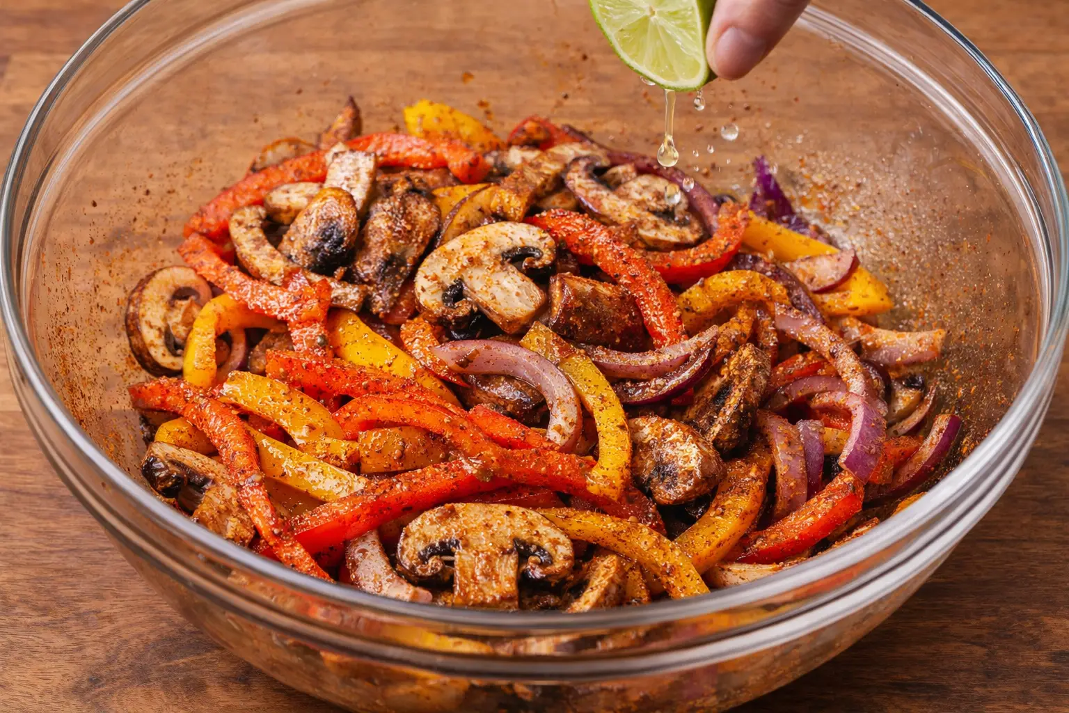 In a large bowl, toss the sliced vegetables with olive oil, chili powder, smoked paprika, cumin, garlic powder, salt, and black pepper. Finish with fresh lime juice for added brightness.