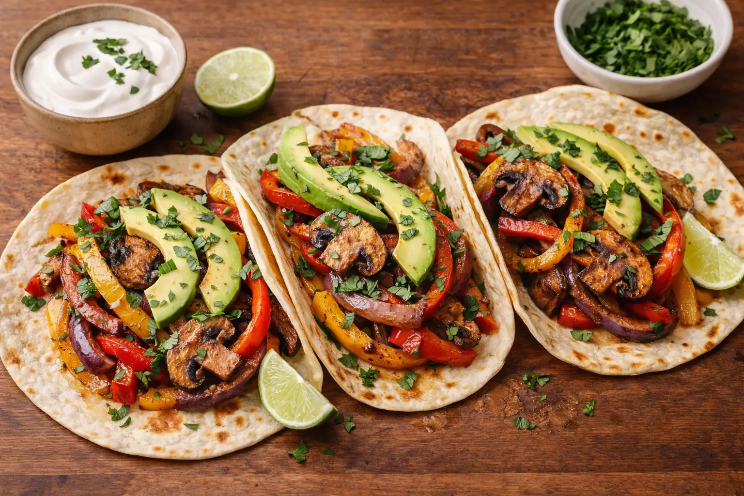 Fill each tortilla with the grilled mushroom and pepper mixture. Top with fresh cilantro, avocado slices, and a squeeze of lime. Serve with vegan sour cream or dairy-free yogurt if desired.