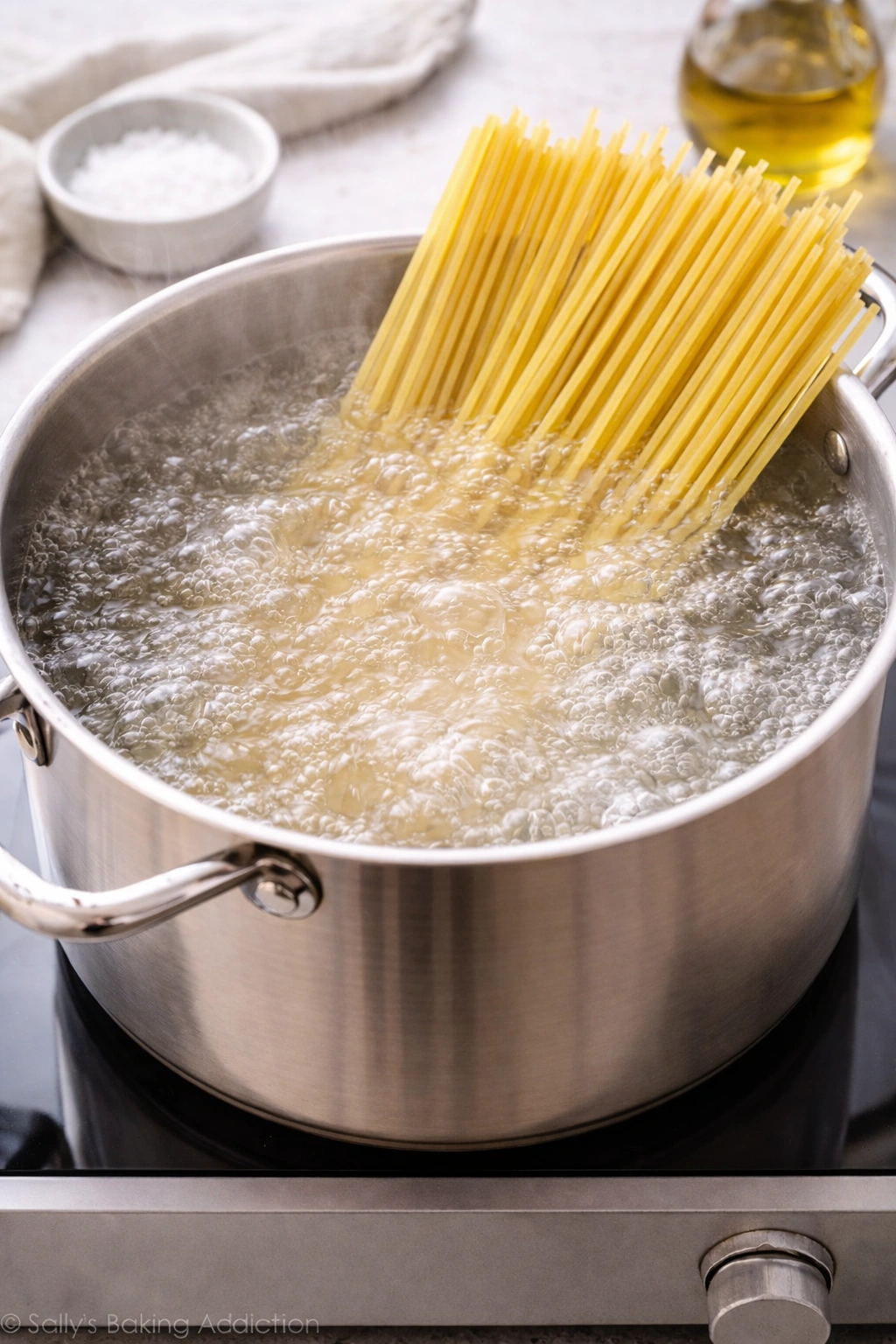 Add the pasta to the boiling water and cook according to package instructions until al dente.