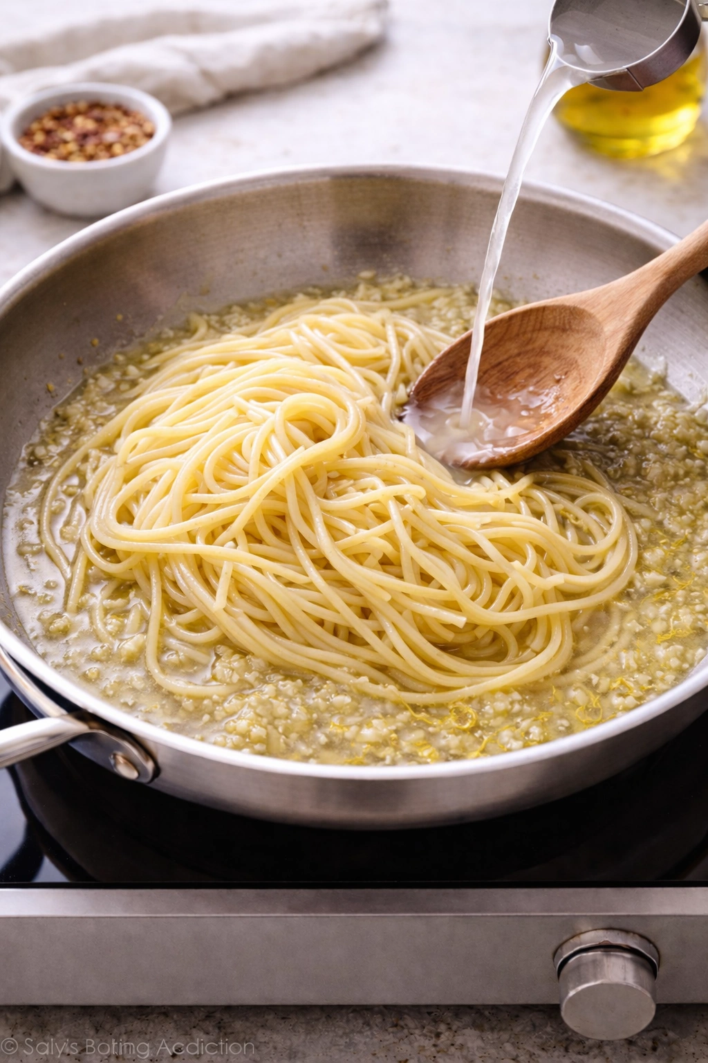 Add the cooked pasta to the skillet, along with a splash of pasta water. Toss to coat the pasta evenly.