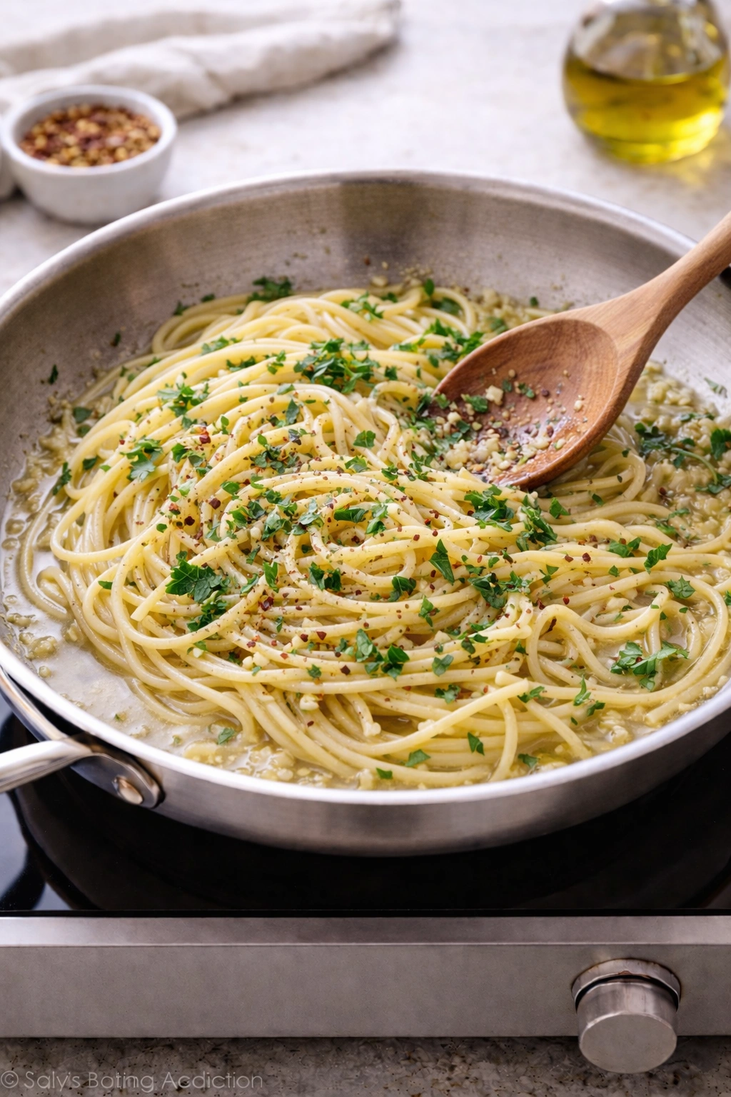 Taste and adjust seasoning before serving. Enjoy your flavorful lemon garlic pasta!
