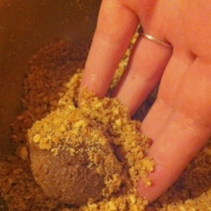 Press into the pretzel crumb mixture, ensuring an even coating on all sides.