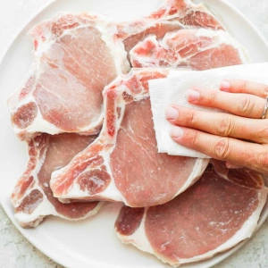- Pat pork chops dry with paper towels and season lightly with salt on both sides.