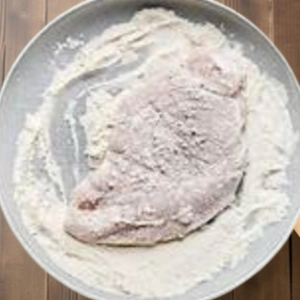 - Then, place flour in a third shallow dish and season with a pinch of salt.