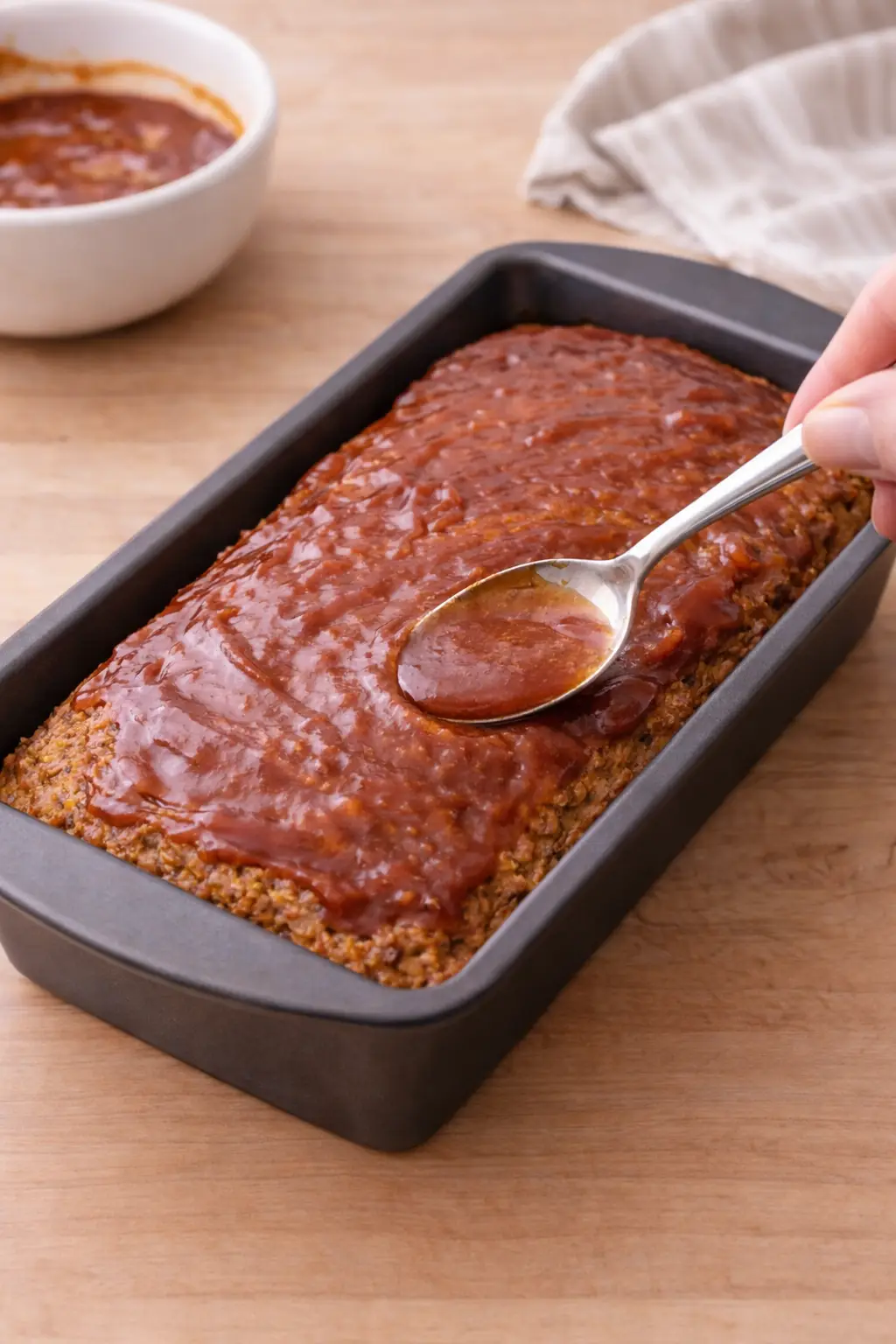 Spoon and spread the glaze evenly over the top of the meatloaf.
