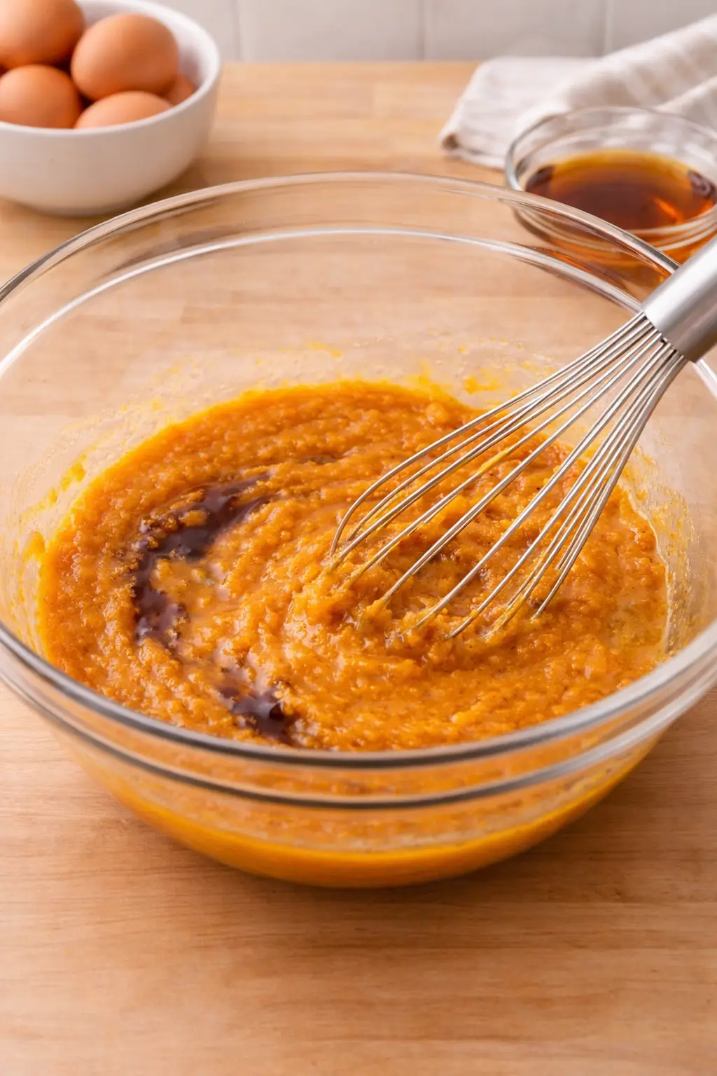 3. In a large bowl, combine pumpkin puree, eggs, Worcestershire sauce, and maple syrup.