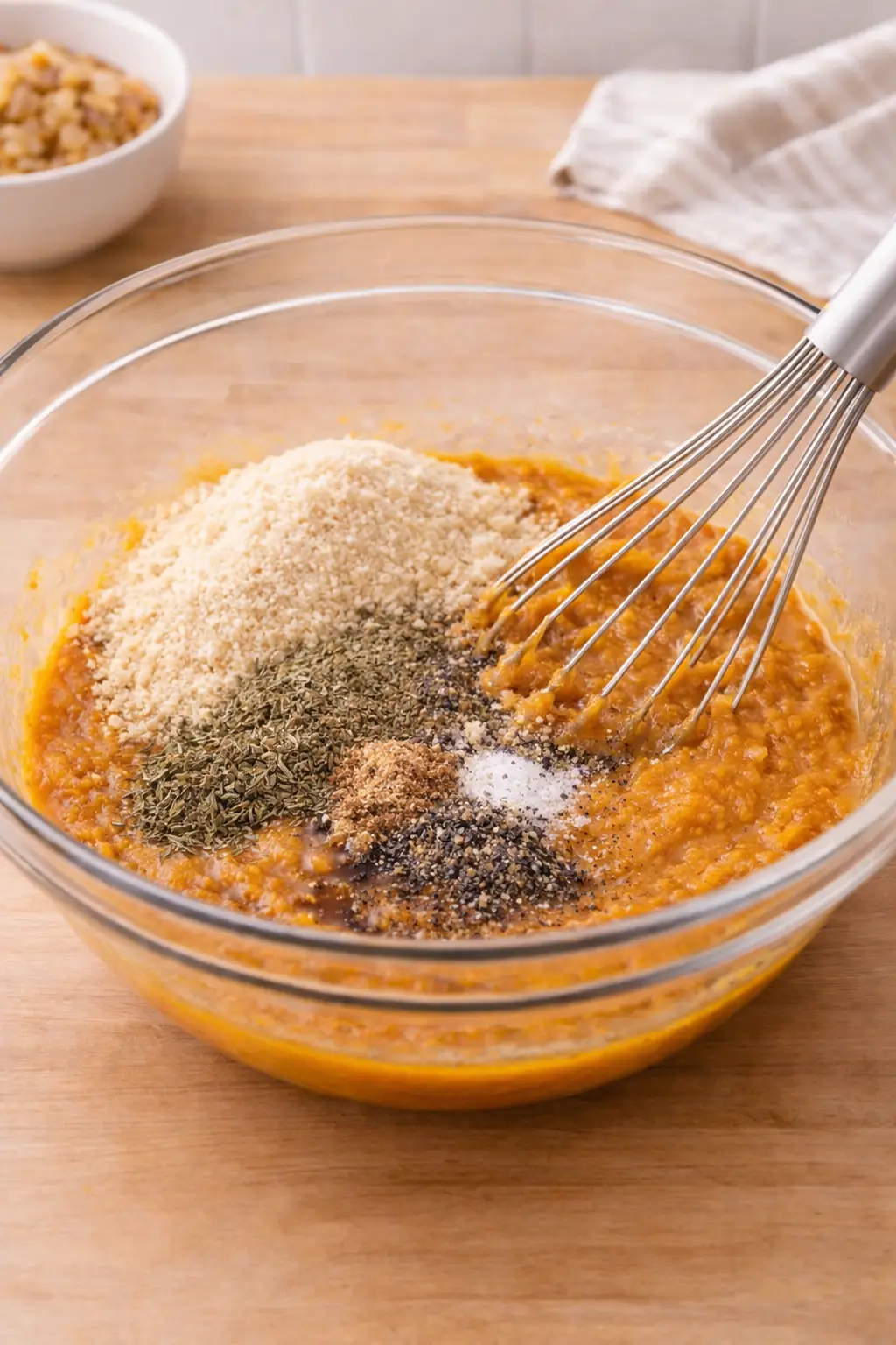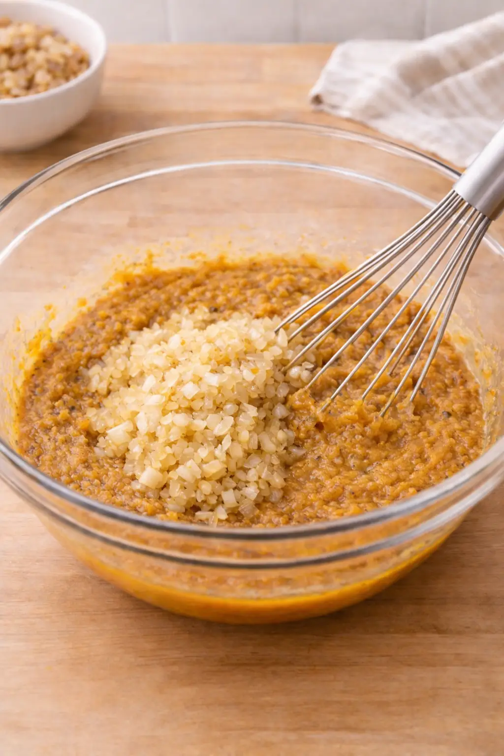 4. Add dry ingredients: Incorporate your breadcrumbs, spices, and cooled onion mixture into the wet ingredients.