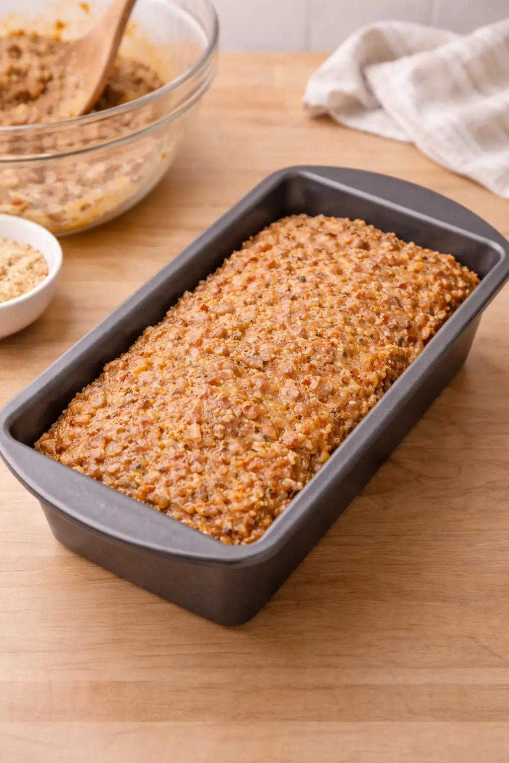 Place the mixture into your prepared loaf pan and gently shape into an even loaf.