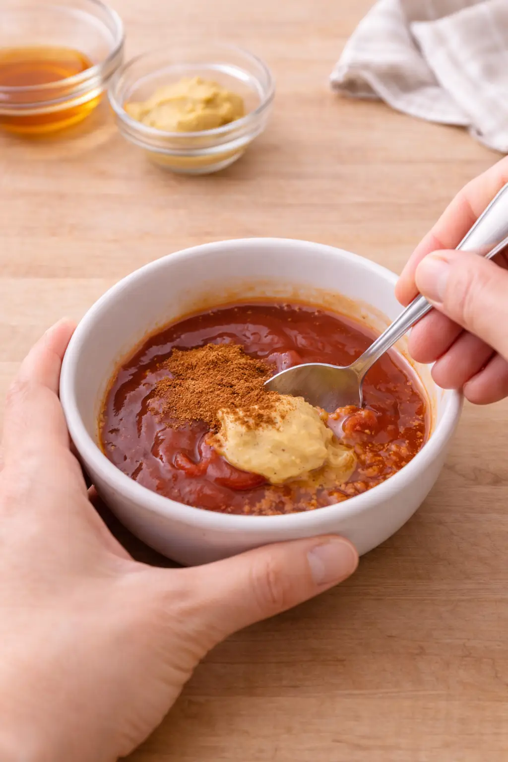 In a small bowl, mix ketchup, maple syrup, Dijon mustard, and a dash of cinnamon until smooth.