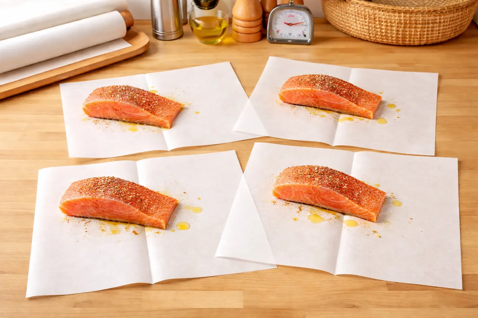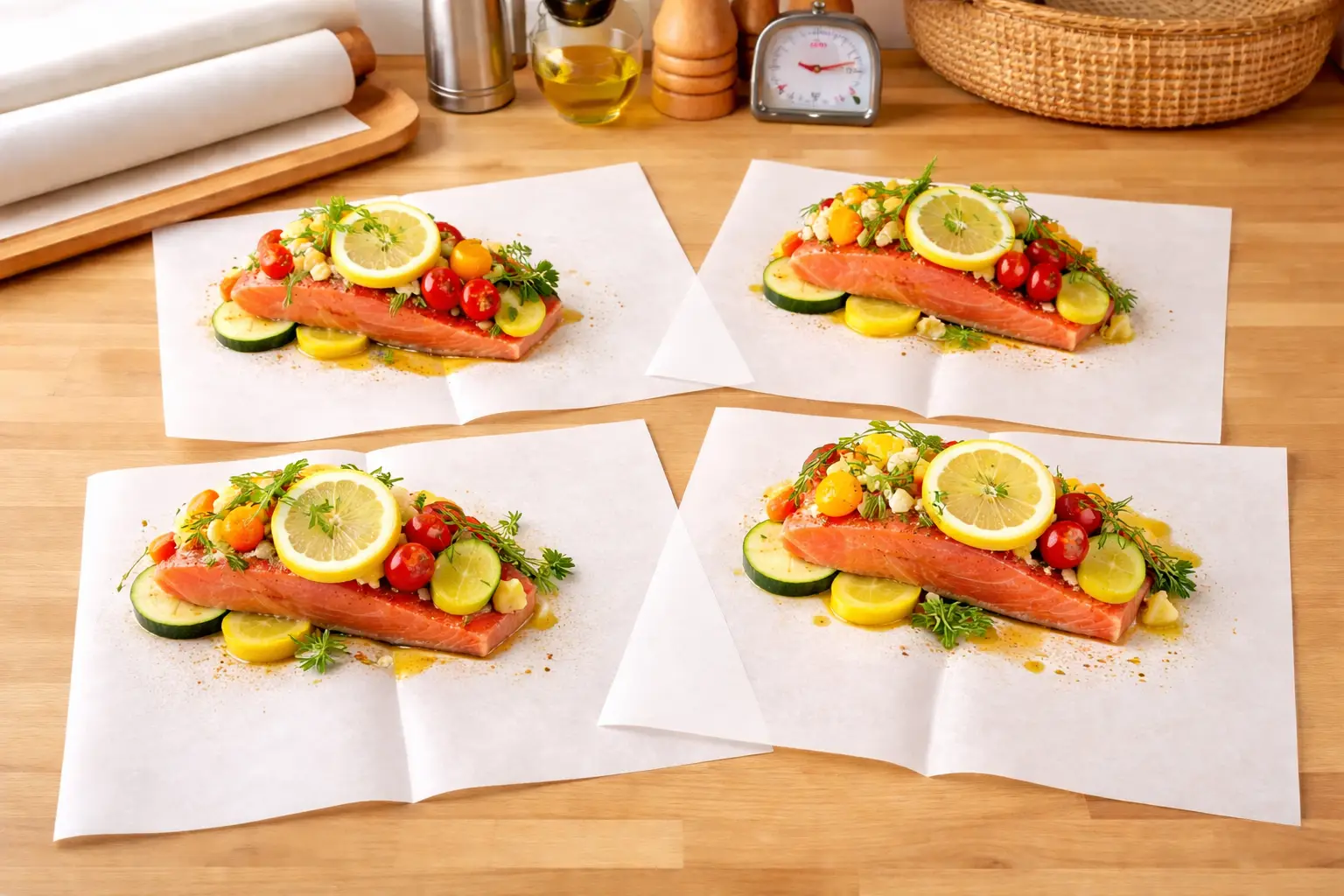 Preheat your oven to 400°F (200°C). Cut four large sheets of parchment paper, fold each in half, then open them flat on your work surface.