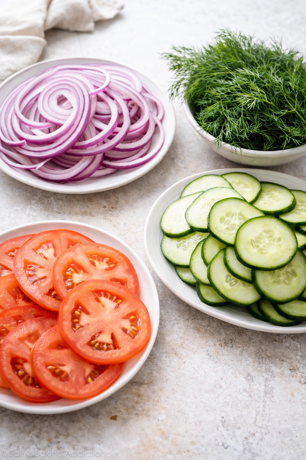 Thinly slice some red onions, tomatoes, and cucumbers. Wash and dry some fresh dill.