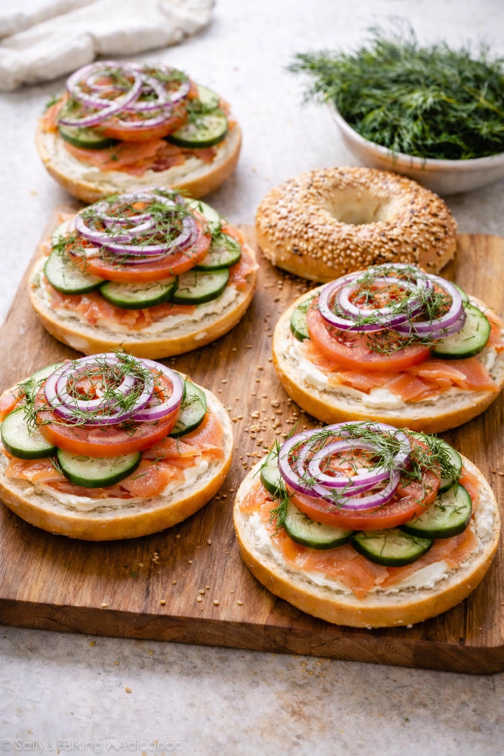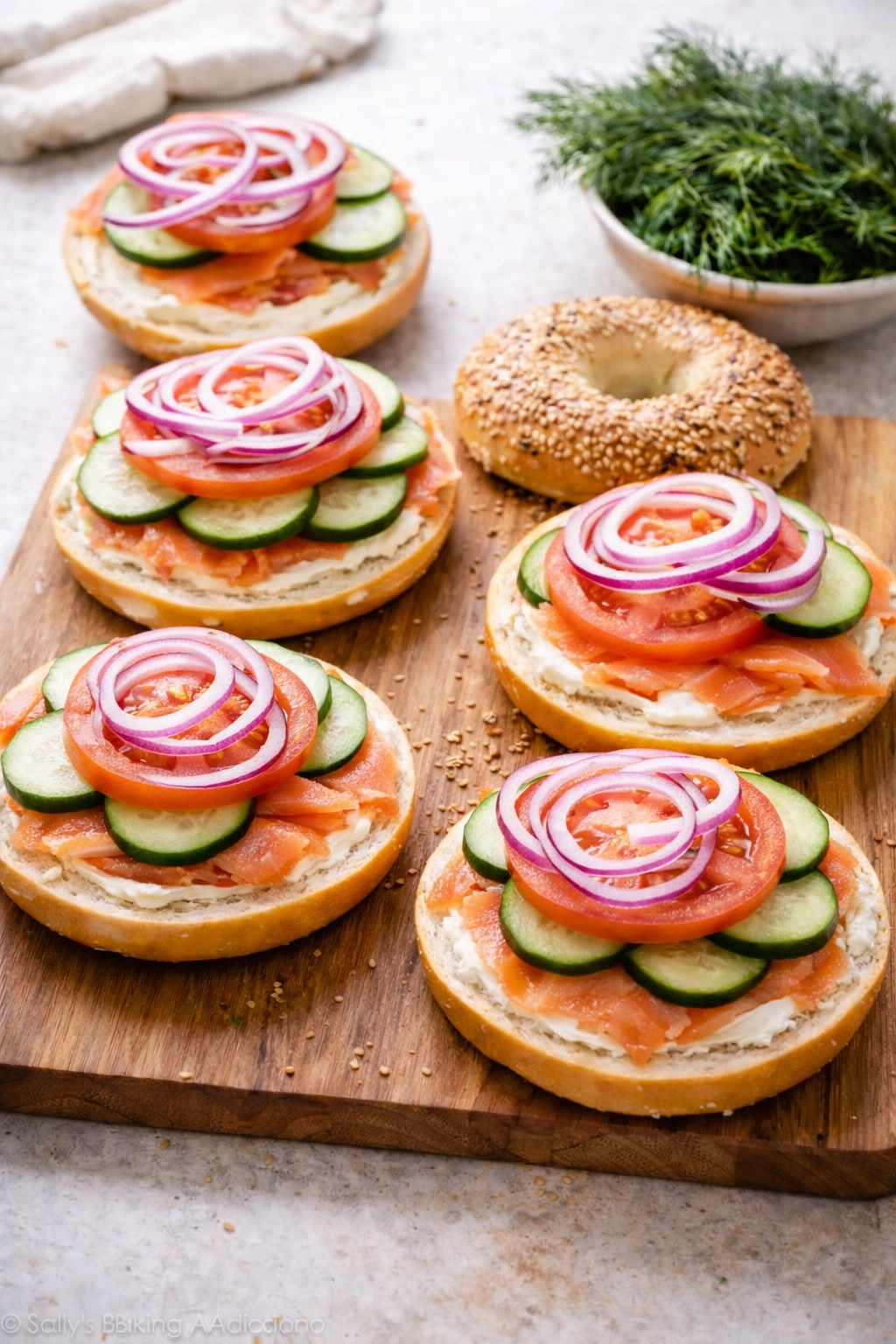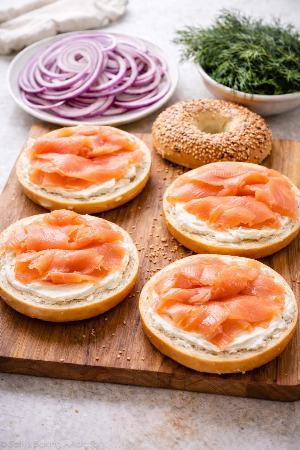 You can prepare the components ahead and assemble them just before serving to keep the bagels fresh and tasty.