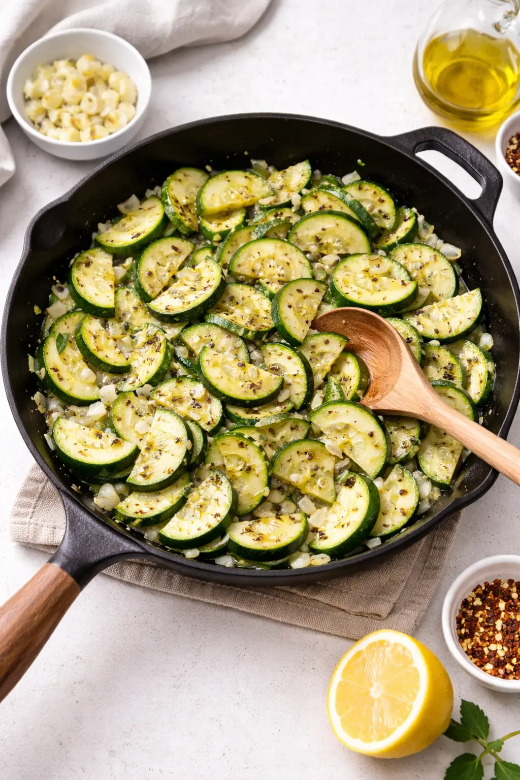 A: Cook the zucchini a few minutes longer to evaporate excess moisture. Additionally, you can salt the sliced zucchini 15 minutes before cooking, then pat dry with paper towels.