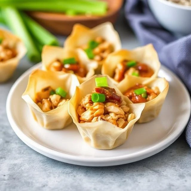 - Spoon the chicken mixture into each wonton cup, filling generously.