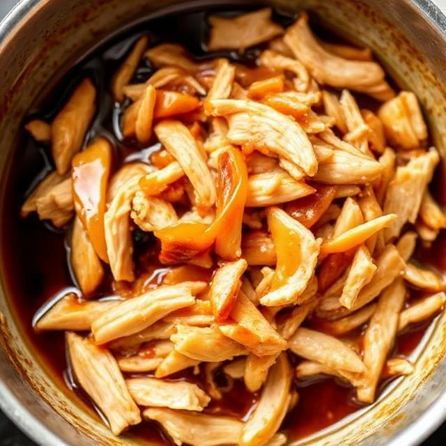 - Stir the shredded chicken into the sauce. Mix thoroughly until the chicken is coated and heated through. Taste and season with salt and pepper. Remove from heat.