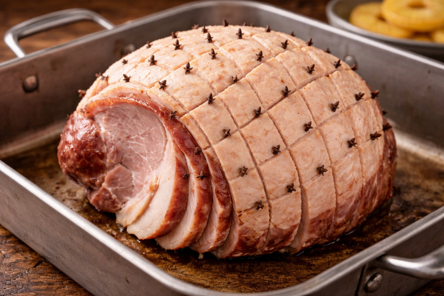 Preheat the oven to 325°F (165°C). Place the ham in a roasting pan, and score the surface in a diamond pattern. Insert whole cloves into the scored areas.Prepare the Glaze