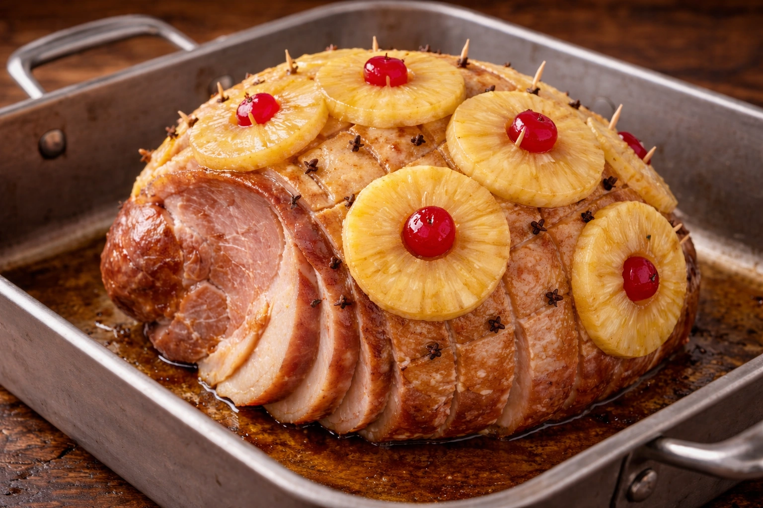 Remove the ham from the oven and let it rest for 15 minutes before slicing. Serve warm with the caramelized pineapple slices.