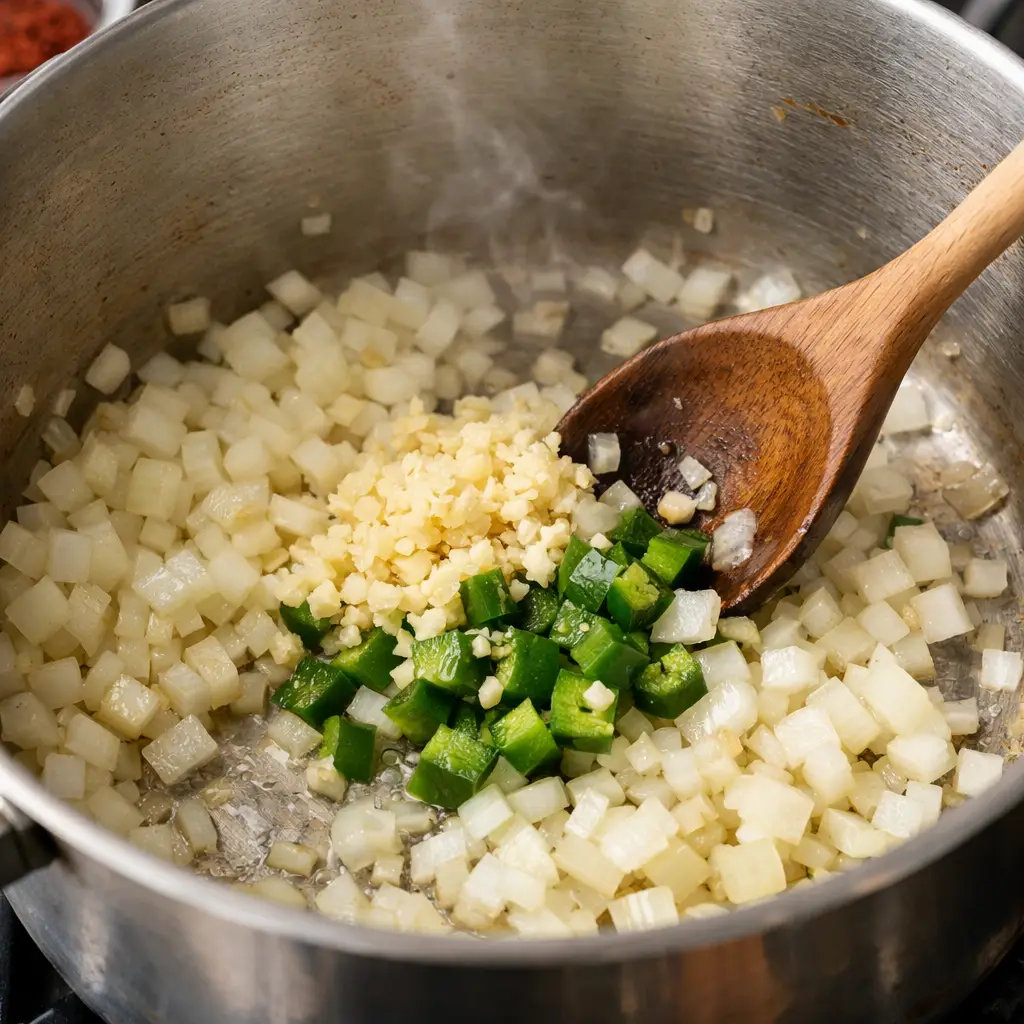 Heat vegetable oil in a large pot over medium heat. Add diced onion and sauté for 3–4 minutes until soft and translucent. Stir in garlic and jalapeño (if using) and cook for another minute until fragrant.
