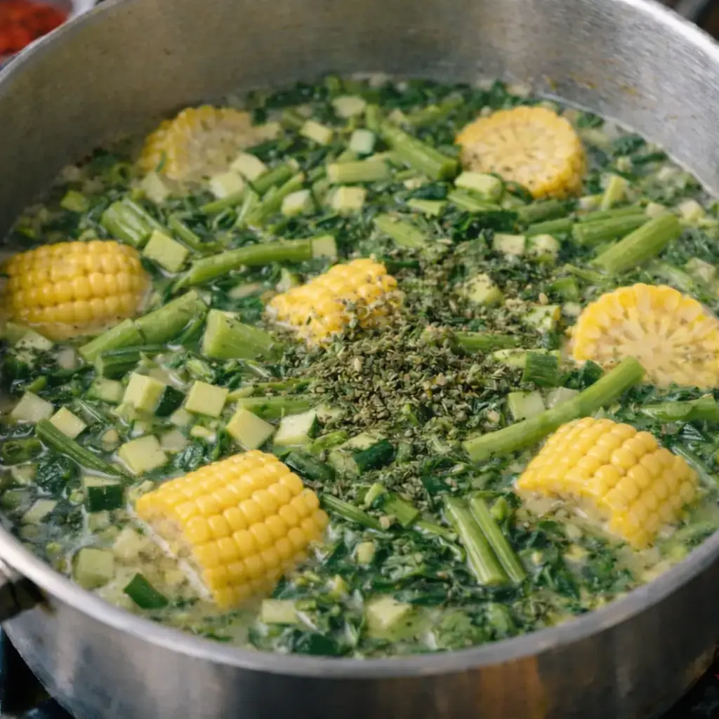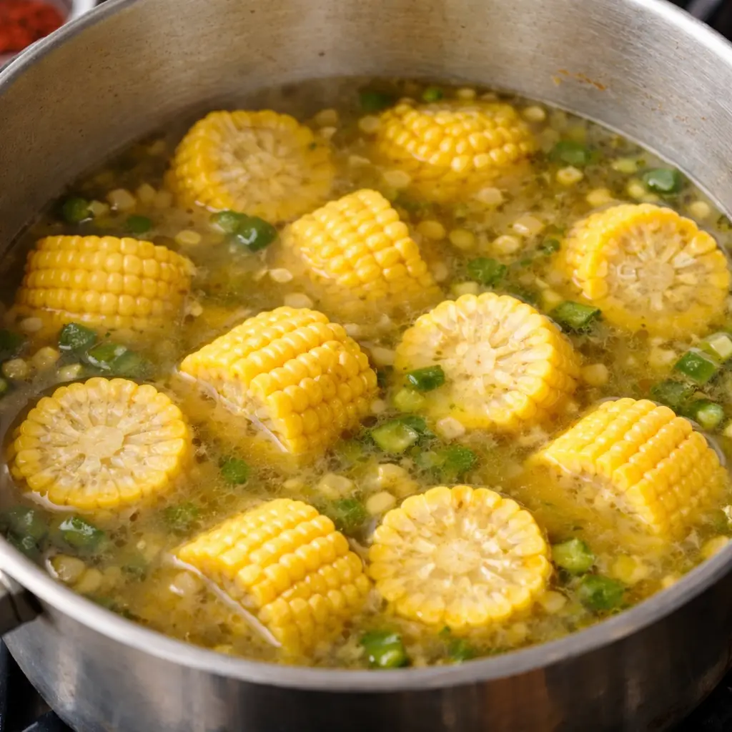 Add the broth: Pour in the vegetable or chicken broth and bring to a gentle simmer. After that, add the corn rounds and let them cook for about 5 minutes to begin softening.